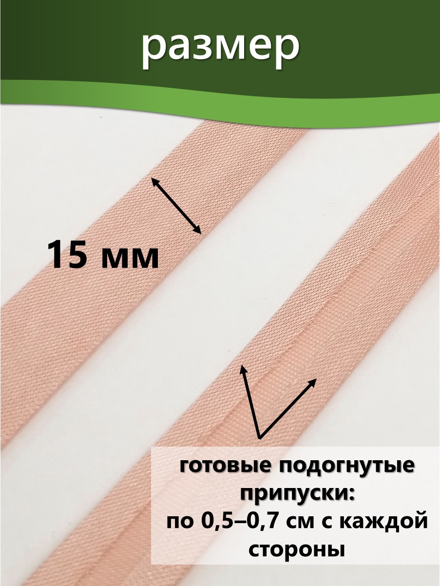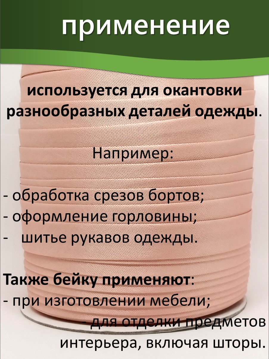 Косая бейка шириной 15 мм используется для обработки краёв текстильных изделий, включая одежду, аксессуары и домашний текстиль. Некоторые области применения: