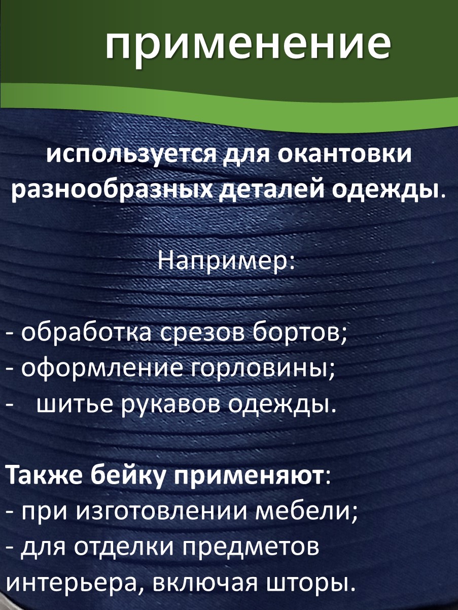 Косая бейка шириной 15 мм используется для обработки краёв текстильных изделий, включая одежду, аксессуары и домашний текстиль. Некоторые области применения: