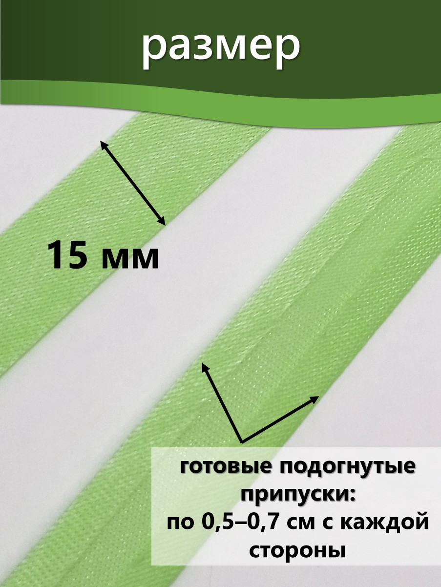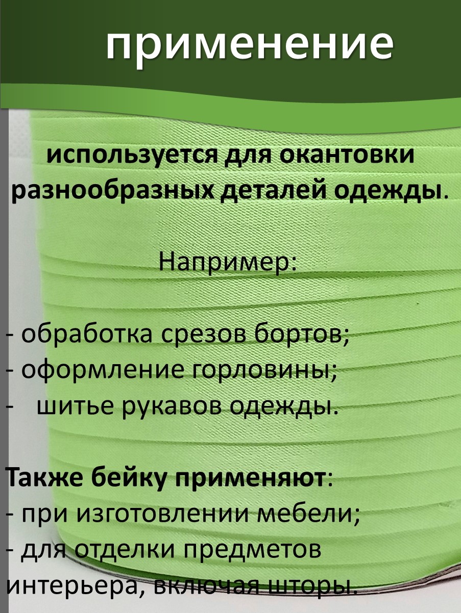 Косая бейка шириной 15 мм используется для обработки краёв текстильных изделий, включая одежду, аксессуары и домашний текстиль. Некоторые области применения: