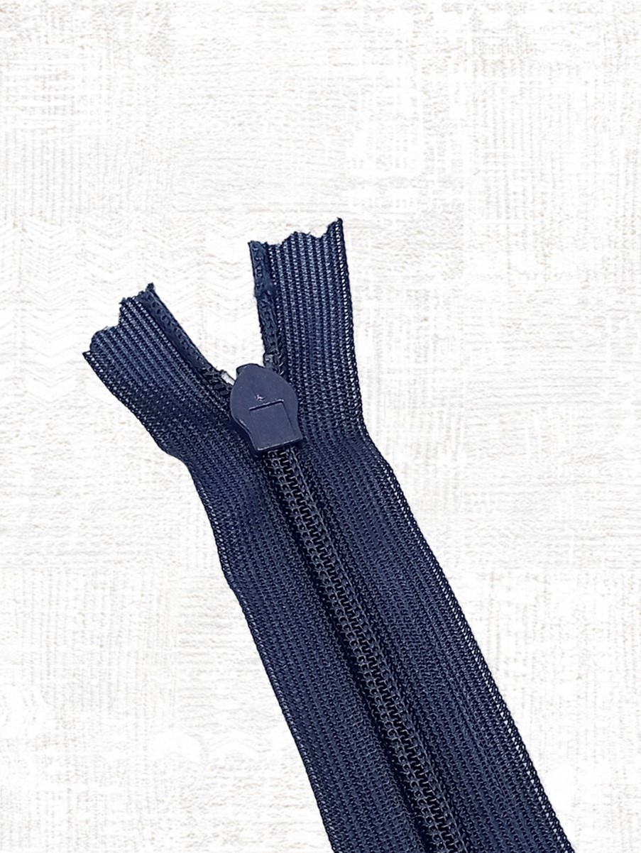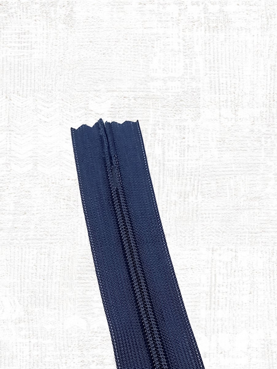 Потайная неразъёмная молния Т3 длиной 20 см (нейлон) имеет особое строение: звенья расположены на изнаночной стороне застёжки и прикрыты текстильной лентой, а с лицевой стороны находится только бегунок. Благодаря этому такая молния на готовом изделии почти незаметна.