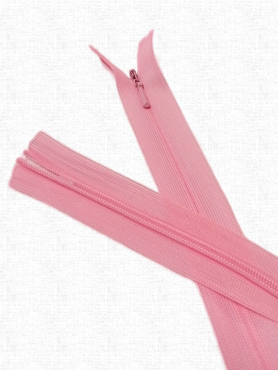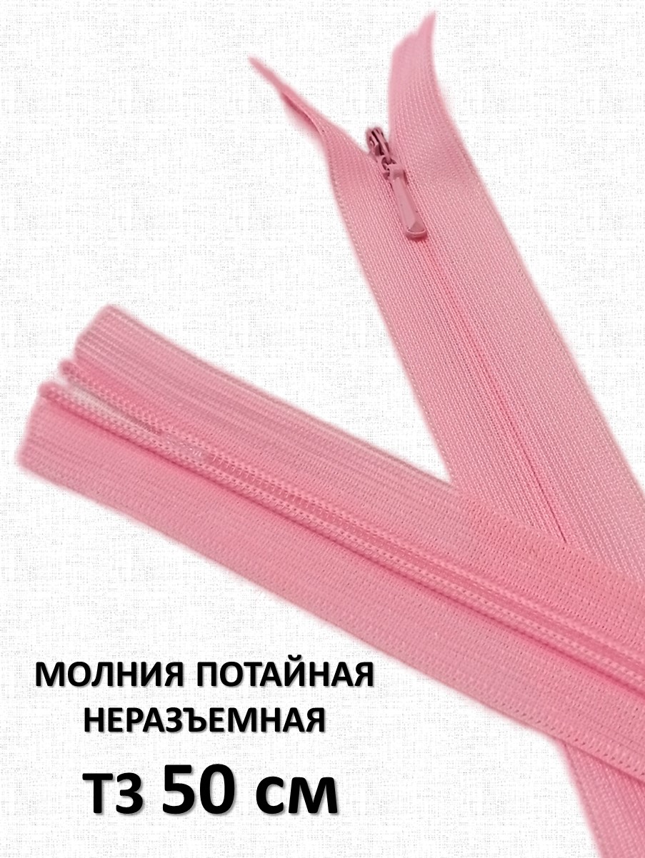 Потайная неразъёмная молния Т3 длиной 50 см (нейлон) имеет особое строение: звенья расположены на изнаночной стороне застёжки и прикрыты текстильной лентой, а с лицевой стороны находится только бегунок. Благодаря этому такая молния на готовом изделии почти незаметна.