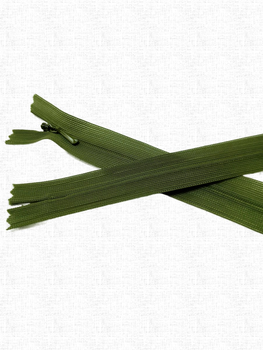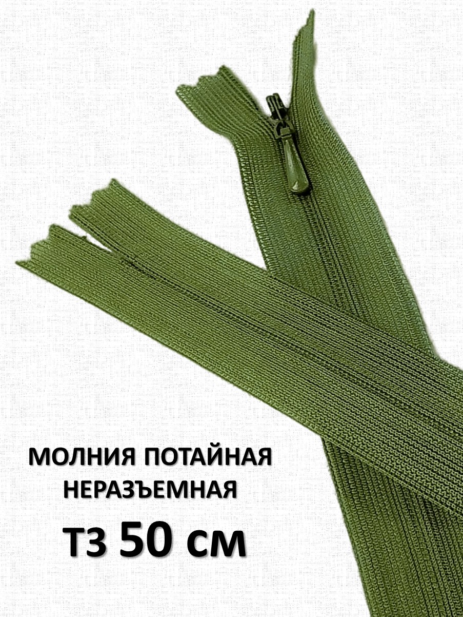 Потайная неразъёмная молния Т3 длиной 50 см (нейлон) имеет особое строение: звенья расположены на изнаночной стороне застёжки и прикрыты текстильной лентой, а с лицевой стороны находится только бегунок. Благодаря этому такая молния на готовом изделии почти незаметна.