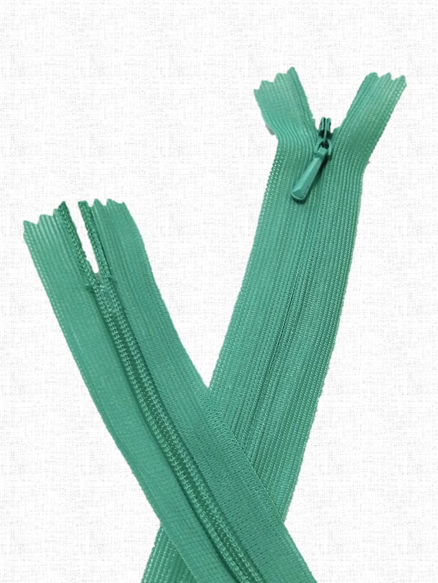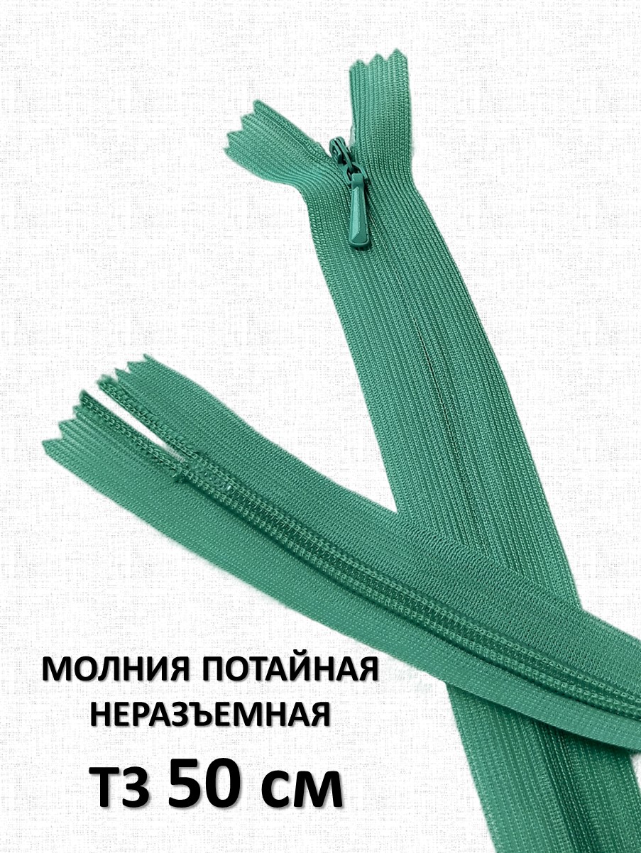 Потайная неразъёмная молния Т3 длиной 50 см (нейлон) имеет особое строение: звенья расположены на изнаночной стороне застёжки и прикрыты текстильной лентой, а с лицевой стороны находится только бегунок. Благодаря этому такая молния на готовом изделии почти незаметна.