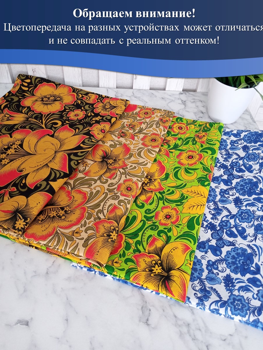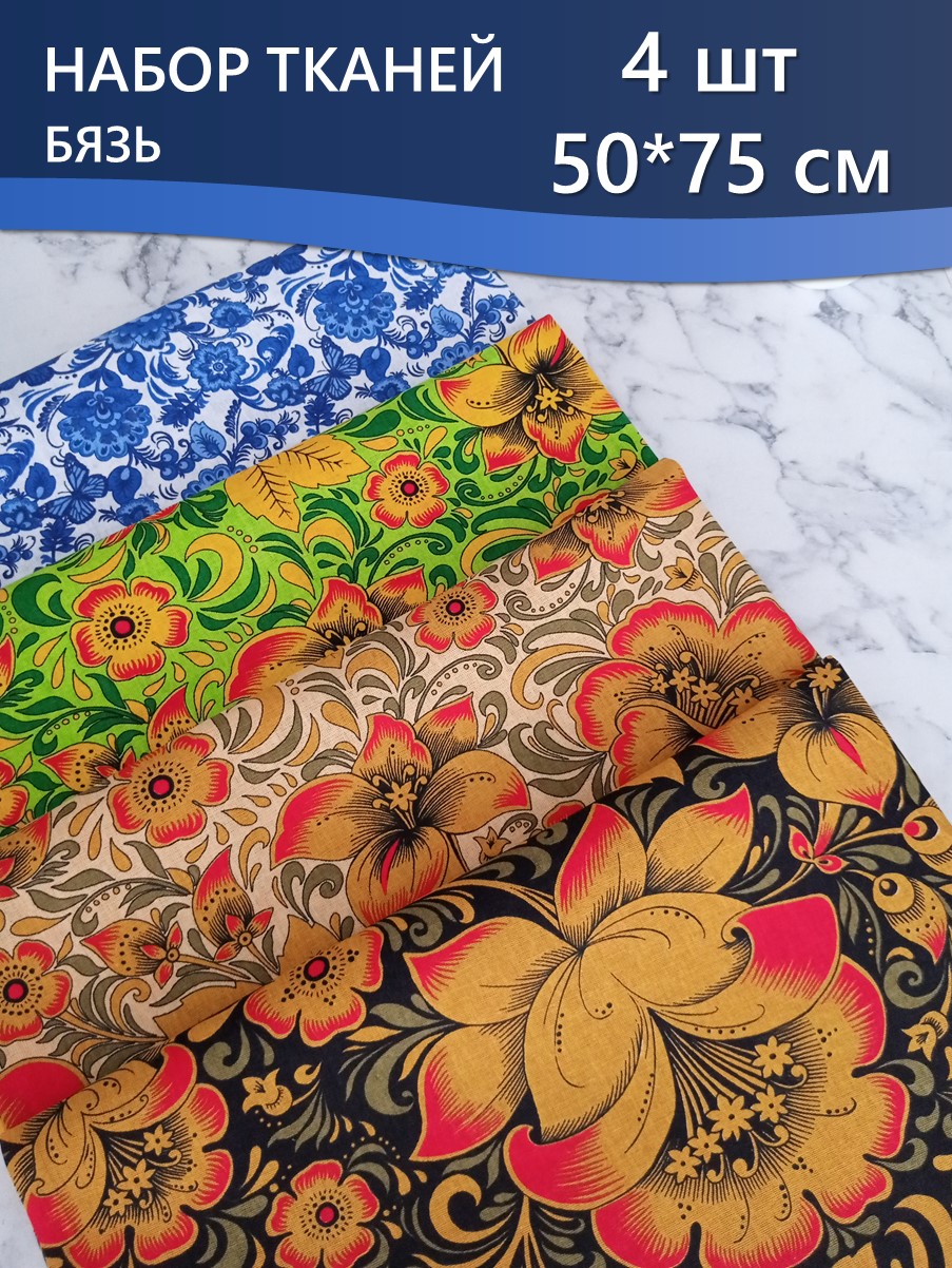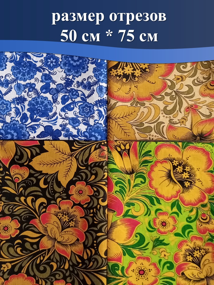 В набор тканей для шитья входит 4 отреза размером 50*75 см.