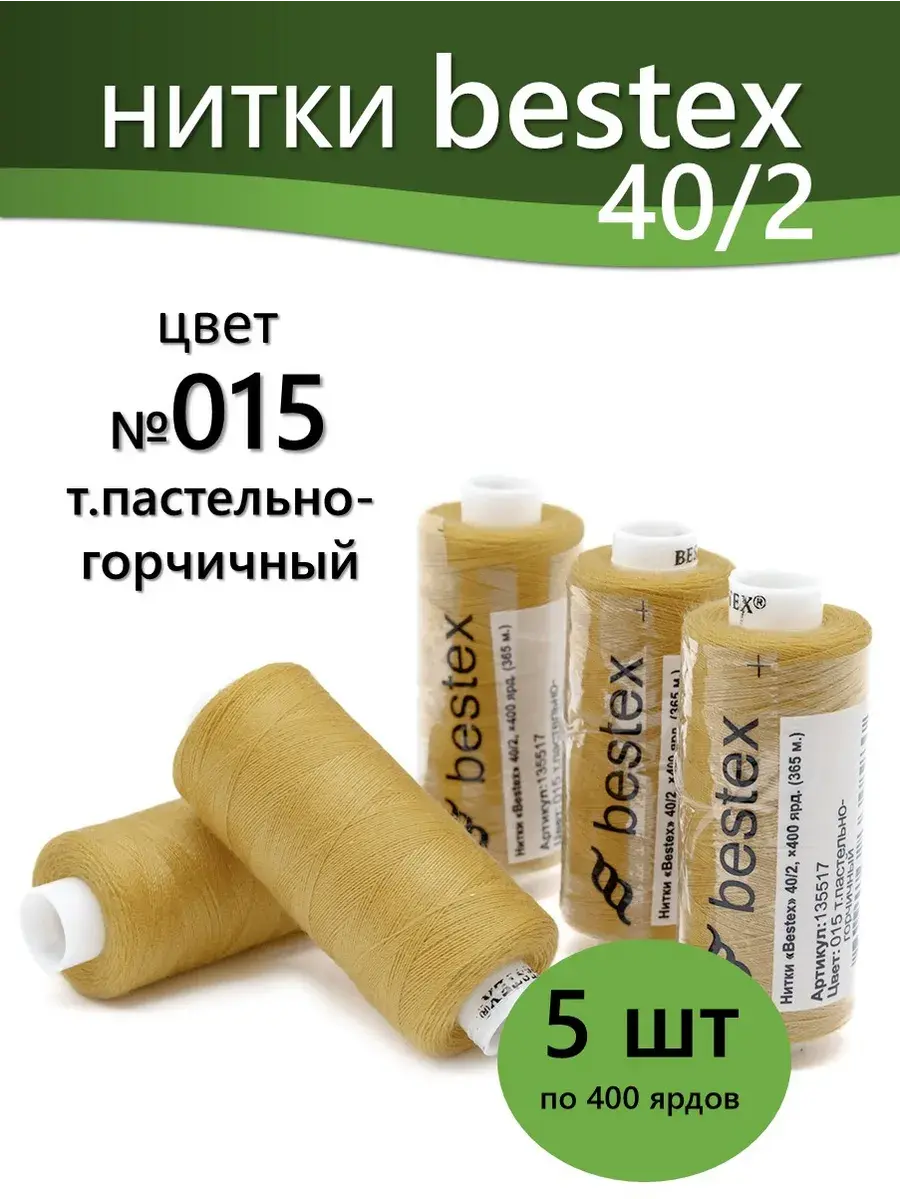 Набор ниток Bestex №40/2 – прекрасный вариант для шитья, ремонта текстильных изделий, рукоделия. Подойдут для бытовых и промышленных швейных машин. Изготовлены из 100 % полиэстера, прочные на разрыв и слегка эластичные, равномерные по толщине, имеют правостороннюю крутку. Обработаны силиконом на 3%, поэтому меньше разрываются при работе на высоких скоростях. Не истончаются и не теряют цвет после многократных стирок и от воздействия ультрафиолетовых лучей. Усадка минимальна, ворс и узелки почти не выражены. Нитки №40/2 подходят для работы с легкими тканями и тканями среднего веса. Назначение: – ремонт текстильных изделий, штопка вещей из трикотажа; – обработка срезов; – шитье вручную и на швейной машине. Линейная плотность: 14,8 x 2 текс. Разрывная нагрузка: 1050 сН. Рекомендуемый размер иглы: №80-90. В упаковке 5 бобин в намотке 400 ярдов.