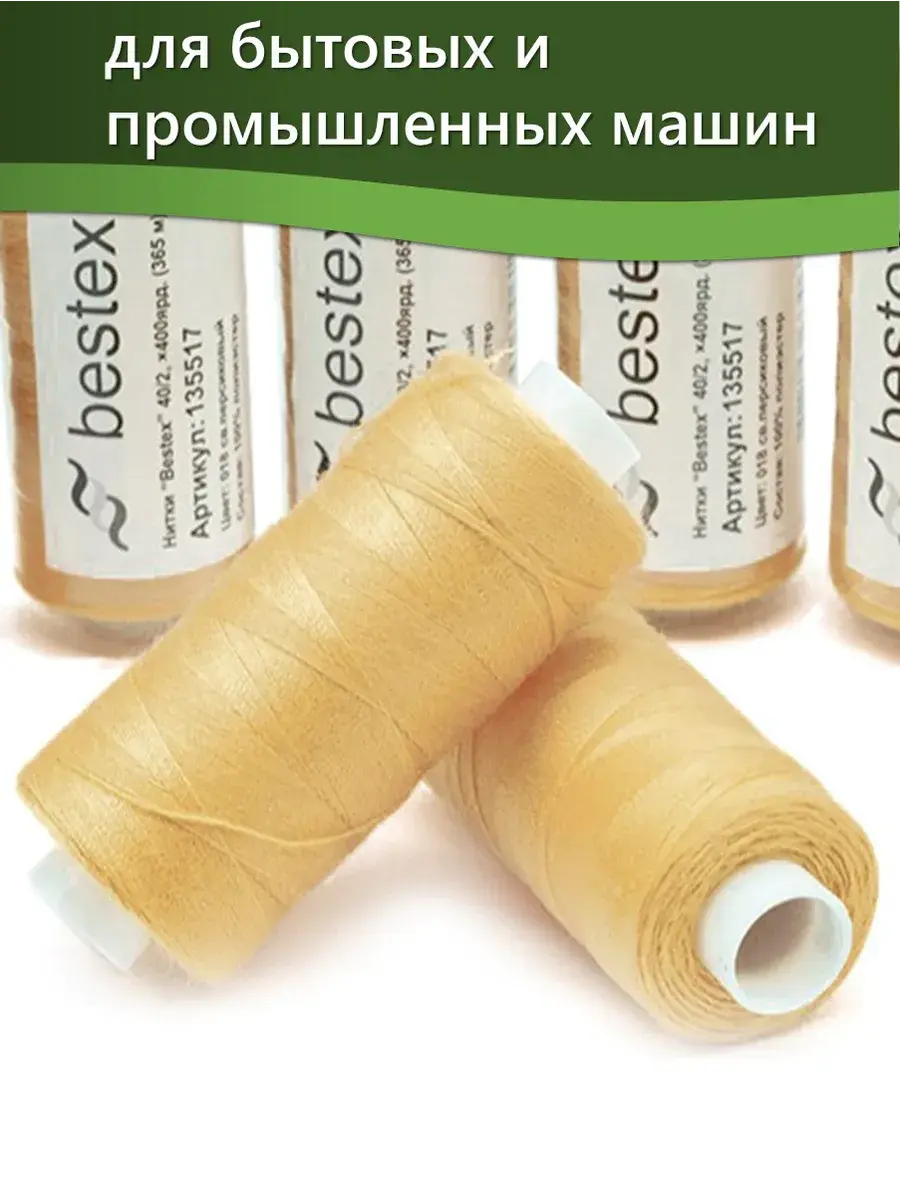 Набор ниток Bestex №40/2 – прекрасный вариант для шитья, ремонта текстильных изделий, рукоделия. Подойдут для бытовых и промышленных швейных машин. Изготовлены из 100 % полиэстера, прочные на разрыв и слегка эластичные, равномерные по толщине, имеют правостороннюю крутку. Обработаны силиконом на 3%, поэтому меньше разрываются при работе на высоких скоростях. Не истончаются и не теряют цвет после многократных стирок и от воздействия ультрафиолетовых лучей. Усадка минимальна, ворс и узелки почти не выражены. Нитки №40/2 подходят для работы с легкими тканями и тканями среднего веса. Назначение: – ремонт текстильных изделий, штопка вещей из трикотажа; – обработка срезов; – шитье вручную и на швейной машине. Линейная плотность: 14,8 x 2 текс. Разрывная нагрузка: 1050 сН. Рекомендуемый размер иглы: №80-90. В упаковке 5 бобин в намотке 400 ярдов.