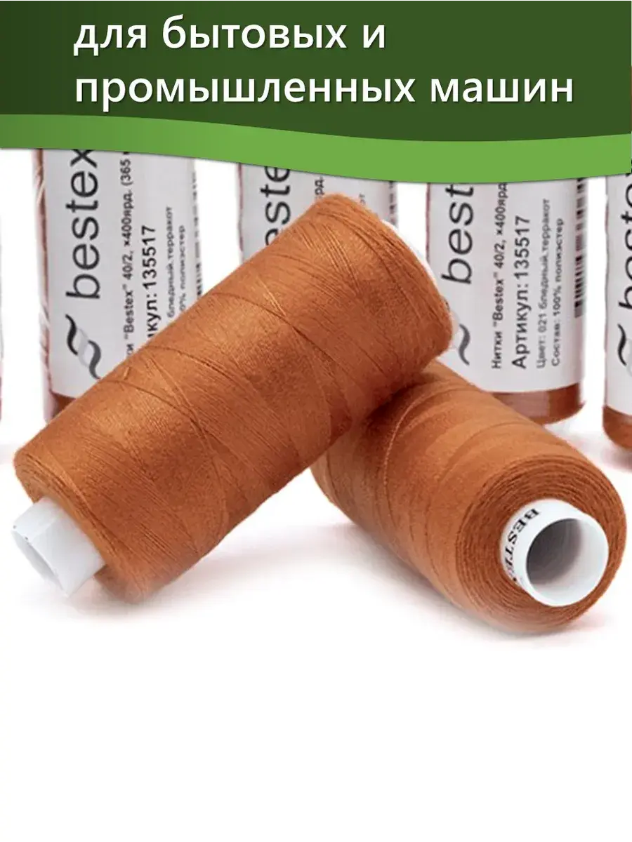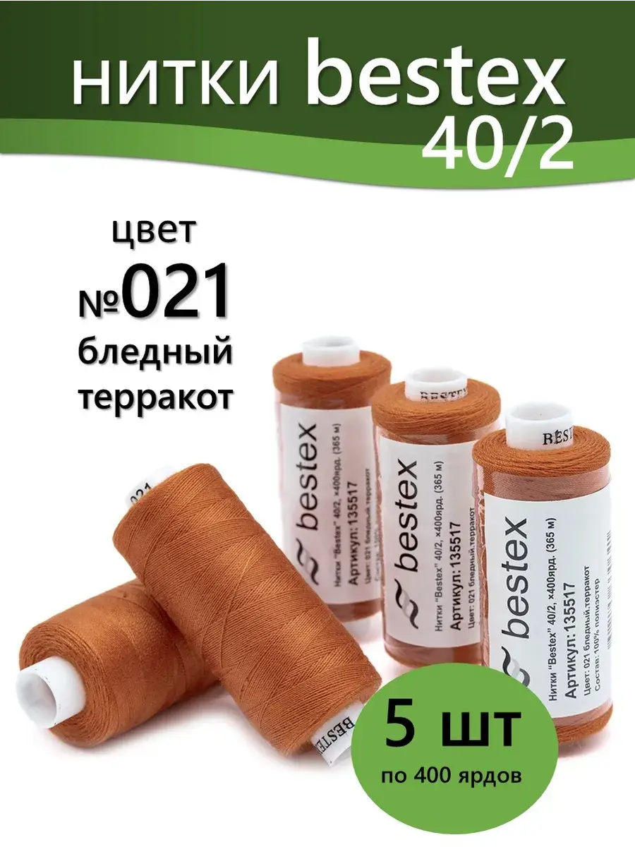Набор ниток Bestex №40/2 – прекрасный вариант для шитья, ремонта текстильных изделий, рукоделия. Подойдут для бытовых и промышленных швейных машин. Изготовлены из 100 % полиэстера, прочные на разрыв и слегка эластичные, равномерные по толщине, имеют правостороннюю крутку. Обработаны силиконом на 3%, поэтому меньше разрываются при работе на высоких скоростях. Не истончаются и не теряют цвет после многократных стирок и от воздействия ультрафиолетовых лучей. Усадка минимальна, ворс и узелки почти не выражены. Нитки №40/2 подходят для работы с легкими тканями и тканями среднего веса. Назначение: – ремонт текстильных изделий, штопка вещей из трикотажа; – обработка срезов; – шитье вручную и на швейной машине. Линейная плотность: 14,8 x 2 текс. Разрывная нагрузка: 1050 сН. Рекомендуемый размер иглы: №80-90. В упаковке 5 бобин в намотке 400 ярдов.