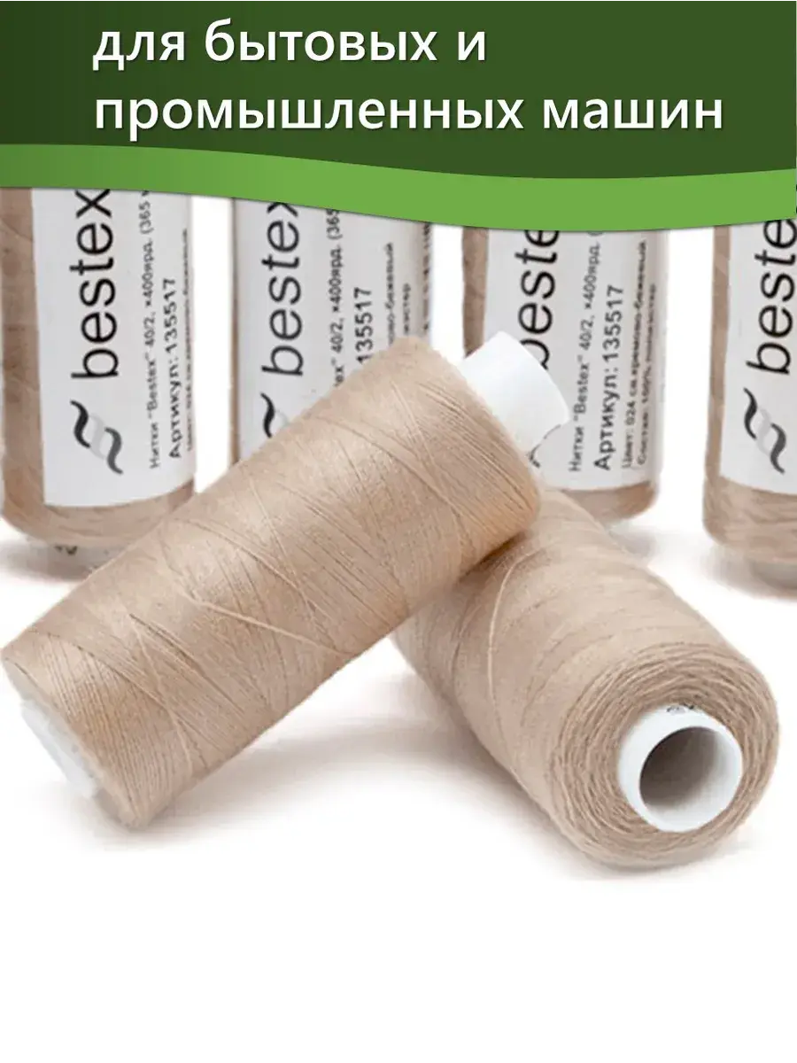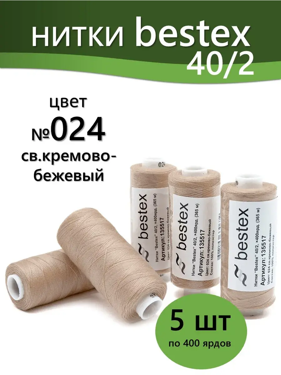 Набор ниток Bestex №40/2 – прекрасный вариант для шитья, ремонта текстильных изделий, рукоделия. Подойдут для бытовых и промышленных швейных машин. Изготовлены из 100 % полиэстера, прочные на разрыв и слегка эластичные, равномерные по толщине, имеют правостороннюю крутку. Обработаны силиконом на 3%, поэтому меньше разрываются при работе на высоких скоростях. Не истончаются и не теряют цвет после многократных стирок и от воздействия ультрафиолетовых лучей. Усадка минимальна, ворс и узелки почти не выражены. Нитки №40/2 подходят для работы с легкими тканями и тканями среднего веса. Назначение: – ремонт текстильных изделий, штопка вещей из трикотажа; – обработка срезов; – шитье вручную и на швейной машине. Линейная плотность: 14,8 x 2 текс. Разрывная нагрузка: 1050 сН. Рекомендуемый размер иглы: №80-90. В упаковке 5 бобин в намотке 400 ярдов.