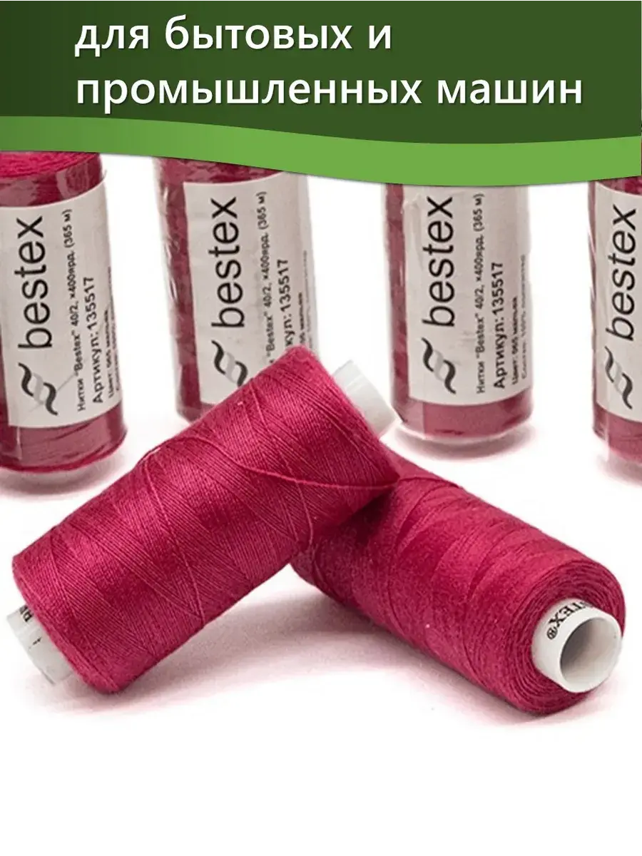 Набор ниток Bestex №40/2 – прекрасный вариант для шитья, ремонта текстильных изделий, рукоделия. Подойдут для бытовых и промышленных швейных машин. Изготовлены из 100 % полиэстера, прочные на разрыв и слегка эластичные, равномерные по толщине, имеют правостороннюю крутку. Обработаны силиконом на 3%, поэтому меньше разрываются при работе на высоких скоростях. Не истончаются и не теряют цвет после многократных стирок и от воздействия ультрафиолетовых лучей. Усадка минимальна, ворс и узелки почти не выражены. Нитки №40/2 подходят для работы с легкими тканями и тканями среднего веса. Назначение: – ремонт текстильных изделий, штопка вещей из трикотажа; – обработка срезов; – шитье вручную и на швейной машине. Линейная плотность: 14,8 x 2 текс. Разрывная нагрузка: 1050 сН. Рекомендуемый размер иглы: №80-90. В упаковке 5 бобин в намотке 400 ярдов.