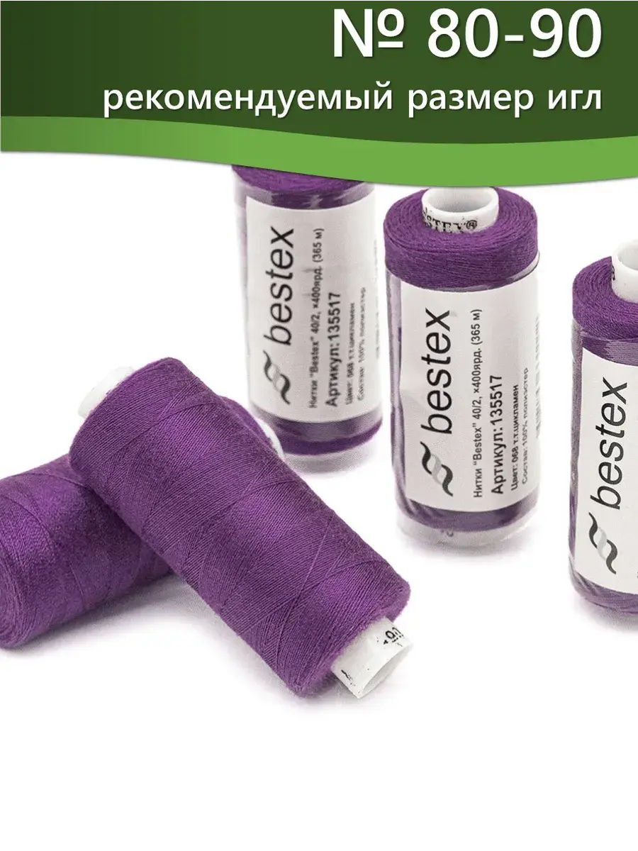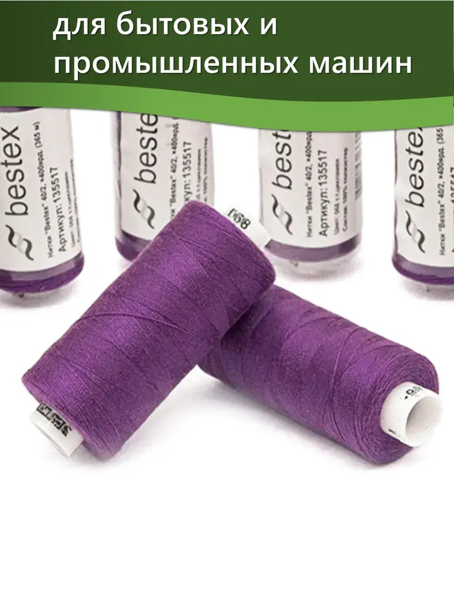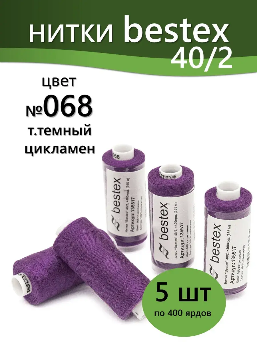 Набор ниток Bestex №40/2 – прекрасный вариант для шитья, ремонта текстильных изделий, рукоделия. Подойдут для бытовых и промышленных швейных машин. Изготовлены из 100 % полиэстера, прочные на разрыв и слегка эластичные, равномерные по толщине, имеют правостороннюю крутку. Обработаны силиконом на 3%, поэтому меньше разрываются при работе на высоких скоростях. Не истончаются и не теряют цвет после многократных стирок и от воздействия ультрафиолетовых лучей. Усадка минимальна, ворс и узелки почти не выражены. Нитки №40/2 подходят для работы с легкими тканями и тканями среднего веса. Назначение: – ремонт текстильных изделий, штопка вещей из трикотажа; – обработка срезов; – шитье вручную и на швейной машине. Линейная плотность: 14,8 x 2 текс. Разрывная нагрузка: 1050 сН. Рекомендуемый размер иглы: №80-90. В упаковке 5 бобин в намотке 400 ярдов.