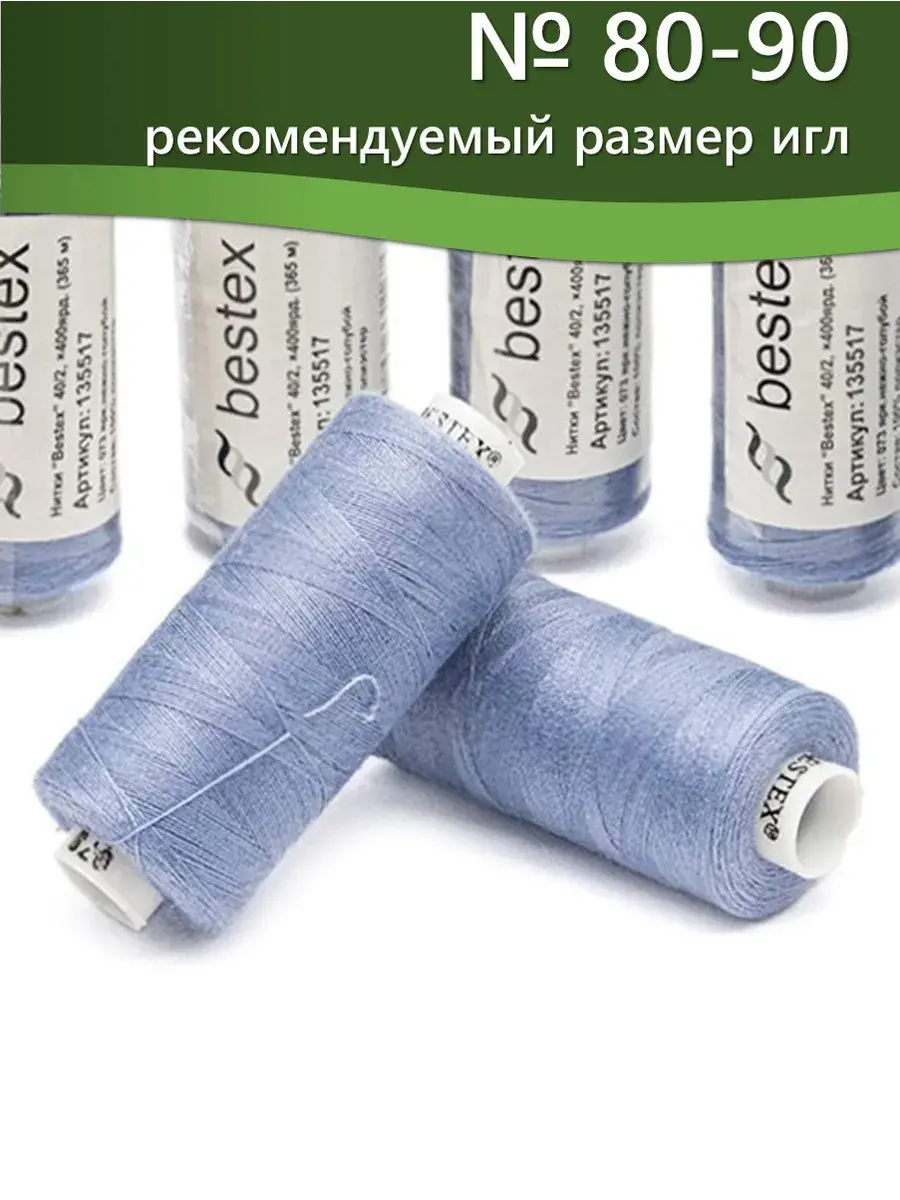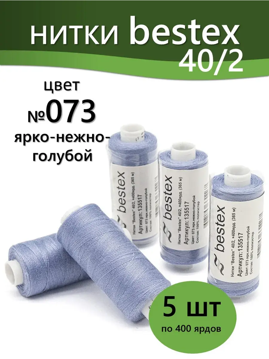 Набор ниток Bestex №40/2 – прекрасный вариант для шитья, ремонта текстильных изделий, рукоделия. Подойдут для бытовых и промышленных швейных машин. Изготовлены из 100 % полиэстера, прочные на разрыв и слегка эластичные, равномерные по толщине, имеют правостороннюю крутку. Обработаны силиконом на 3%, поэтому меньше разрываются при работе на высоких скоростях. Не истончаются и не теряют цвет после многократных стирок и от воздействия ультрафиолетовых лучей. Усадка минимальна, ворс и узелки почти не выражены. Нитки №40/2 подходят для работы с легкими тканями и тканями среднего веса. Назначение: – ремонт текстильных изделий, штопка вещей из трикотажа; – обработка срезов; – шитье вручную и на швейной машине. Линейная плотность: 14,8 x 2 текс. Разрывная нагрузка: 1050 сН. Рекомендуемый размер иглы: №80-90. В упаковке 5 бобин в намотке 400 ярдов.