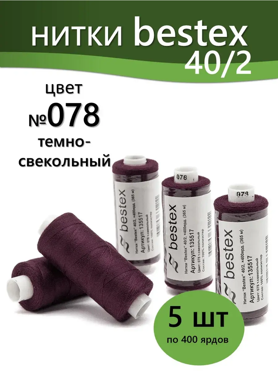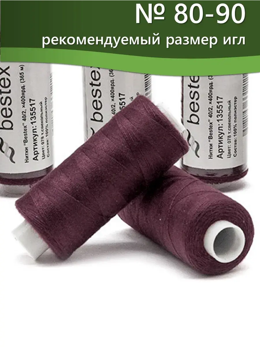 Набор ниток Bestex №40/2 – прекрасный вариант для шитья, ремонта текстильных изделий, рукоделия. Подойдут для бытовых и промышленных швейных машин. Изготовлены из 100 % полиэстера, прочные на разрыв и слегка эластичные, равномерные по толщине, имеют правостороннюю крутку. Обработаны силиконом на 3%, поэтому меньше разрываются при работе на высоких скоростях. Не истончаются и не теряют цвет после многократных стирок и от воздействия ультрафиолетовых лучей. Усадка минимальна, ворс и узелки почти не выражены. Нитки №40/2 подходят для работы с легкими тканями и тканями среднего веса. Назначение: – ремонт текстильных изделий, штопка вещей из трикотажа; – обработка срезов; – шитье вручную и на швейной машине. Линейная плотность: 14,8 x 2 текс. Разрывная нагрузка: 1050 сН. Рекомендуемый размер иглы: №80-90. В упаковке 5 бобин в намотке 400 ярдов.