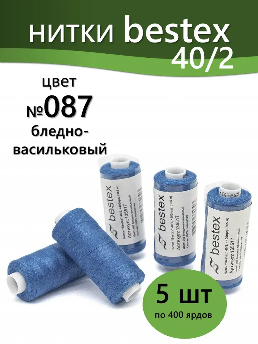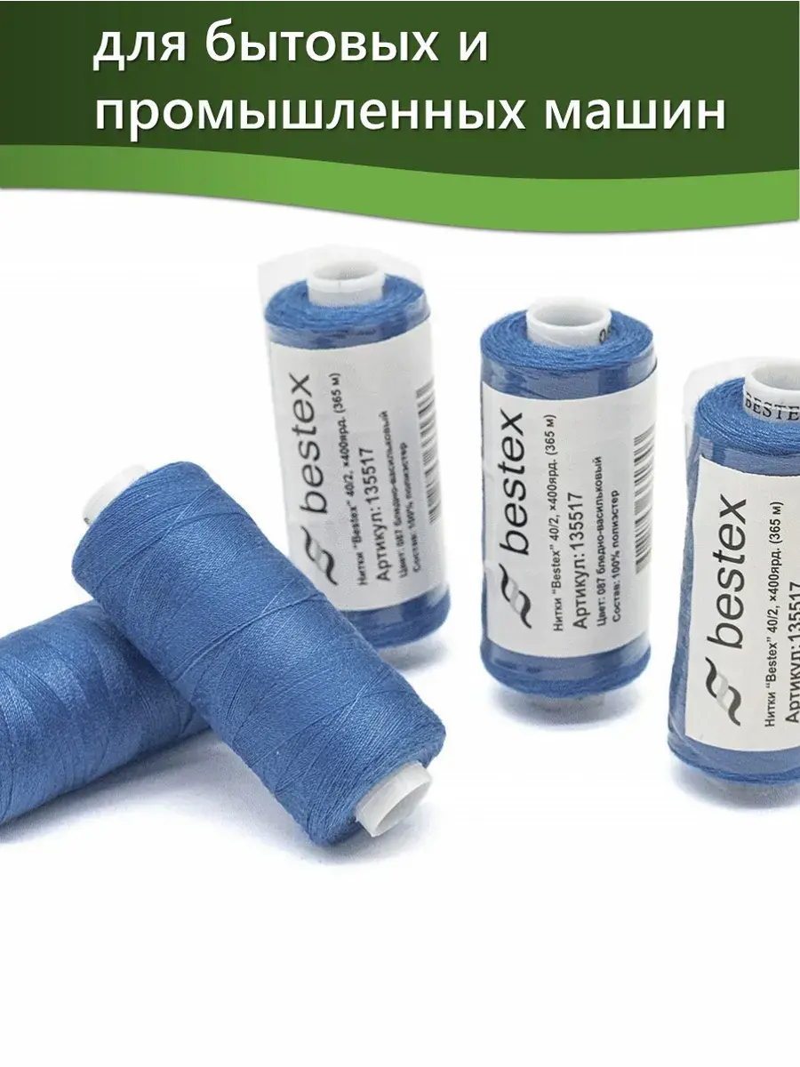 Набор ниток Bestex №40/2 – прекрасный вариант для шитья, ремонта текстильных изделий, рукоделия. Подойдут для бытовых и промышленных швейных машин. Изготовлены из 100 % полиэстера, прочные на разрыв и слегка эластичные, равномерные по толщине, имеют правостороннюю крутку. Обработаны силиконом на 3%, поэтому меньше разрываются при работе на высоких скоростях. Не истончаются и не теряют цвет после многократных стирок и от воздействия ультрафиолетовых лучей. Усадка минимальна, ворс и узелки почти не выражены. Нитки №40/2 подходят для работы с легкими тканями и тканями среднего веса. Назначение: – ремонт текстильных изделий, штопка вещей из трикотажа; – обработка срезов; – шитье вручную и на швейной машине. Линейная плотность: 14,8 x 2 текс. Разрывная нагрузка: 1050 сН. Рекомендуемый размер иглы: №80-90. В упаковке 5 бобин в намотке 400 ярдов.