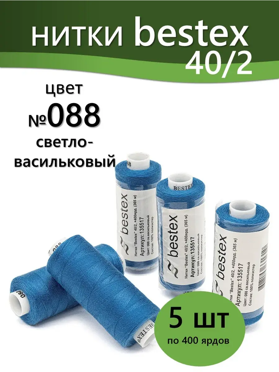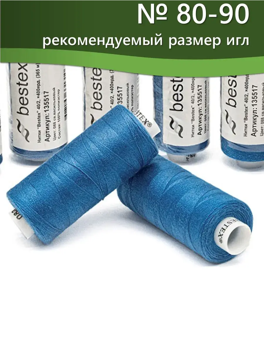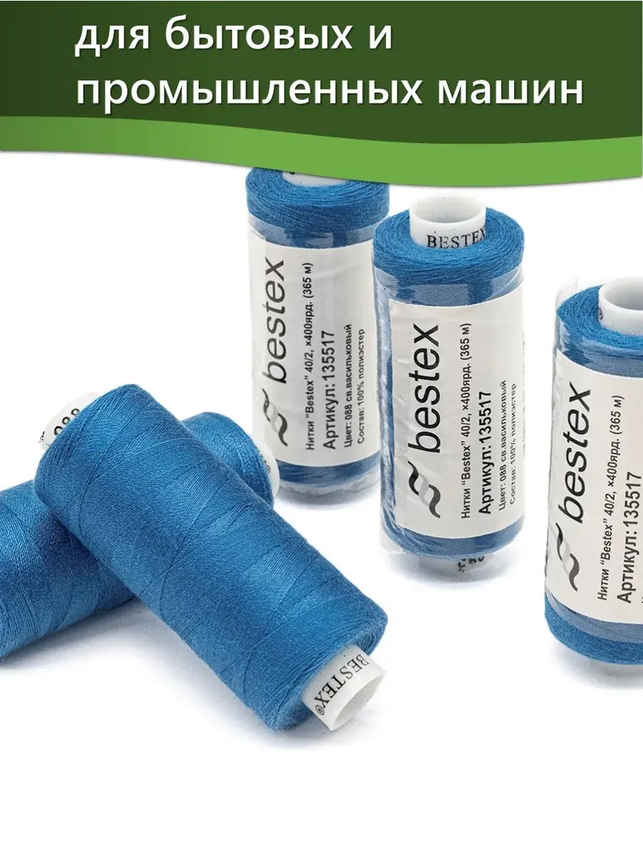 Набор ниток Bestex №40/2 – прекрасный вариант для шитья, ремонта текстильных изделий, рукоделия. Подойдут для бытовых и промышленных швейных машин. Изготовлены из 100 % полиэстера, прочные на разрыв и слегка эластичные, равномерные по толщине, имеют правостороннюю крутку. Обработаны силиконом на 3%, поэтому меньше разрываются при работе на высоких скоростях. Не истончаются и не теряют цвет после многократных стирок и от воздействия ультрафиолетовых лучей. Усадка минимальна, ворс и узелки почти не выражены. Нитки №40/2 подходят для работы с легкими тканями и тканями среднего веса. Назначение: – ремонт текстильных изделий, штопка вещей из трикотажа; – обработка срезов; – шитье вручную и на швейной машине. Линейная плотность: 14,8 x 2 текс. Разрывная нагрузка: 1050 сН. Рекомендуемый размер иглы: №80-90. В упаковке 5 бобин в намотке 400 ярдов.