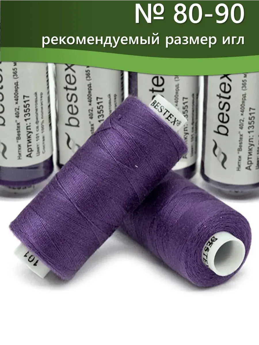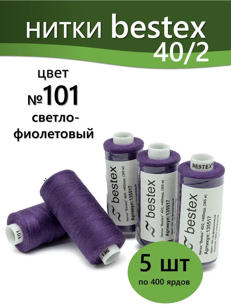 Набор ниток Bestex №40/2 – прекрасный вариант для шитья, ремонта текстильных изделий, рукоделия. Подойдут для бытовых и промышленных швейных машин. Изготовлены из 100 % полиэстера, прочные на разрыв и слегка эластичные, равномерные по толщине, имеют правостороннюю крутку. Обработаны силиконом на 3%, поэтому меньше разрываются при работе на высоких скоростях. Не истончаются и не теряют цвет после многократных стирок и от воздействия ультрафиолетовых лучей. Усадка минимальна, ворс и узелки почти не выражены. Нитки №40/2 подходят для работы с легкими тканями и тканями среднего веса. Назначение: – ремонт текстильных изделий, штопка вещей из трикотажа; – обработка срезов; – шитье вручную и на швейной машине. Линейная плотность: 14,8 x 2 текс. Разрывная нагрузка: 1050 сН. Рекомендуемый размер иглы: №80-90. В упаковке 5 бобин в намотке 400 ярдов.