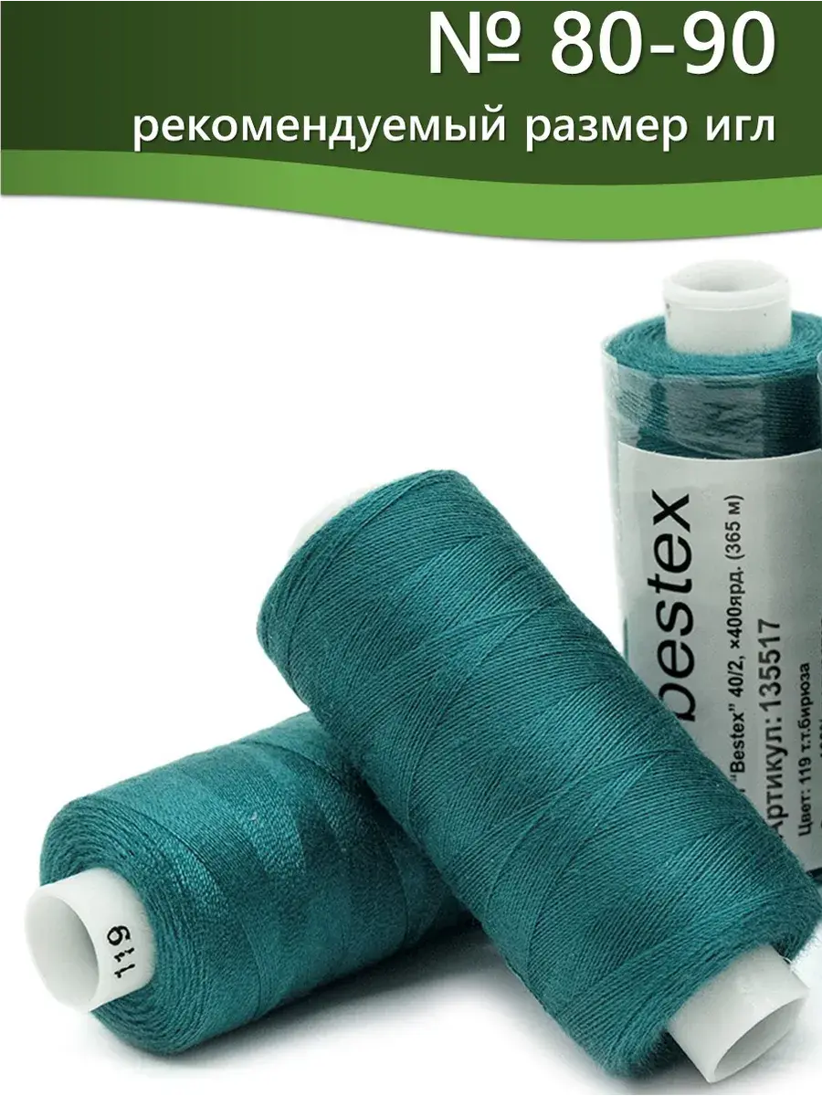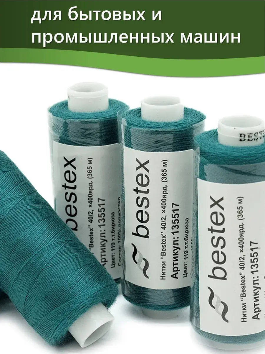 Набор ниток Bestex №40/2 – прекрасный вариант для шитья, ремонта текстильных изделий, рукоделия. Подойдут для бытовых и промышленных швейных машин. Изготовлены из 100 % полиэстера, прочные на разрыв и слегка эластичные, равномерные по толщине, имеют правостороннюю крутку. Обработаны силиконом на 3%, поэтому меньше разрываются при работе на высоких скоростях. Не истончаются и не теряют цвет после многократных стирок и от воздействия ультрафиолетовых лучей. Усадка минимальна, ворс и узелки почти не выражены. Нитки №40/2 подходят для работы с легкими тканями и тканями среднего веса. Назначение: – ремонт текстильных изделий, штопка вещей из трикотажа; – обработка срезов; – шитье вручную и на швейной машине. Линейная плотность: 14,8 x 2 текс. Разрывная нагрузка: 1050 сН. Рекомендуемый размер иглы: №80-90. В упаковке 5 бобин в намотке 400 ярдов.