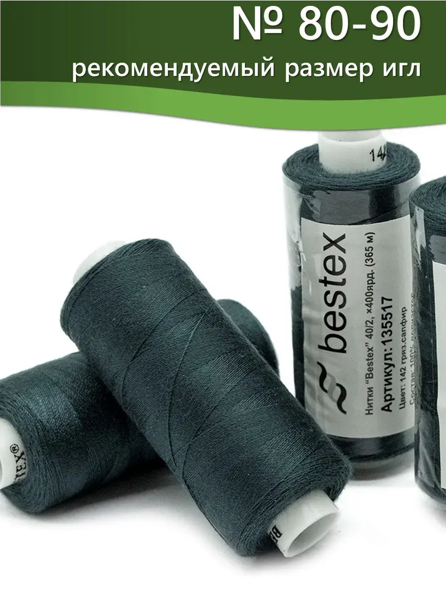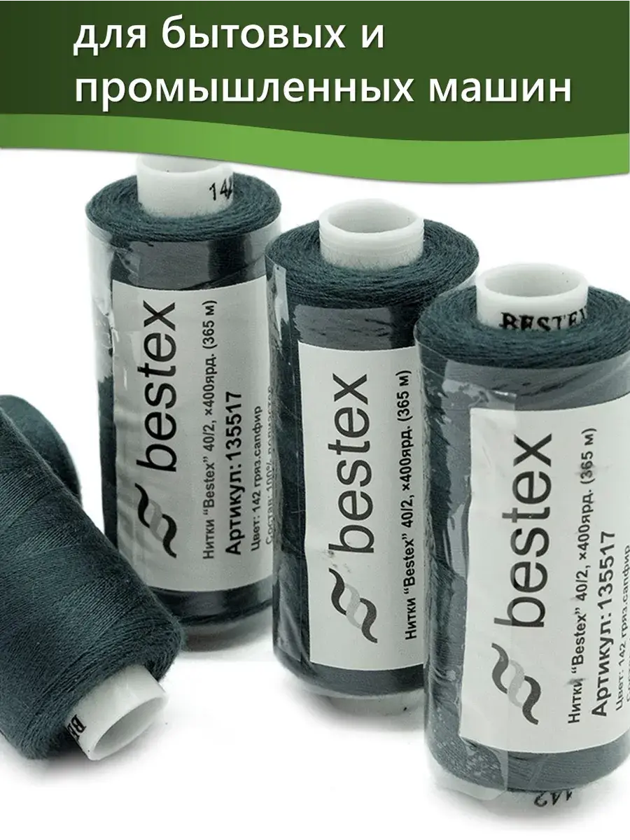 Набор ниток Bestex №40/2 – прекрасный вариант для шитья, ремонта текстильных изделий, рукоделия. Подойдут для бытовых и промышленных швейных машин. Изготовлены из 100 % полиэстера, прочные на разрыв и слегка эластичные, равномерные по толщине, имеют правостороннюю крутку. Обработаны силиконом на 3%, поэтому меньше разрываются при работе на высоких скоростях. Не истончаются и не теряют цвет после многократных стирок и от воздействия ультрафиолетовых лучей. Усадка минимальна, ворс и узелки почти не выражены. Нитки №40/2 подходят для работы с легкими тканями и тканями среднего веса. Назначение: – ремонт текстильных изделий, штопка вещей из трикотажа; – обработка срезов; – шитье вручную и на швейной машине. Линейная плотность: 14,8 x 2 текс. Разрывная нагрузка: 1050 сН. Рекомендуемый размер иглы: №80-90. В упаковке 5 бобин в намотке 400 ярдов.