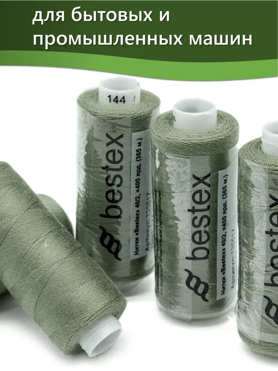 Набор ниток Bestex №40/2 – прекрасный вариант для шитья, ремонта текстильных изделий, рукоделия. Подойдут для бытовых и промышленных швейных машин. Изготовлены из 100 % полиэстера, прочные на разрыв и слегка эластичные, равномерные по толщине, имеют правостороннюю крутку. Обработаны силиконом на 3%, поэтому меньше разрываются при работе на высоких скоростях. Не истончаются и не теряют цвет после многократных стирок и от воздействия ультрафиолетовых лучей. Усадка минимальна, ворс и узелки почти не выражены. Нитки №40/2 подходят для работы с легкими тканями и тканями среднего веса. Назначение: – ремонт текстильных изделий, штопка вещей из трикотажа; – обработка срезов; – шитье вручную и на швейной машине. Линейная плотность: 14,8 x 2 текс. Разрывная нагрузка: 1050 сН. Рекомендуемый размер иглы: №80-90. В упаковке 5 бобин в намотке 400 ярдов.