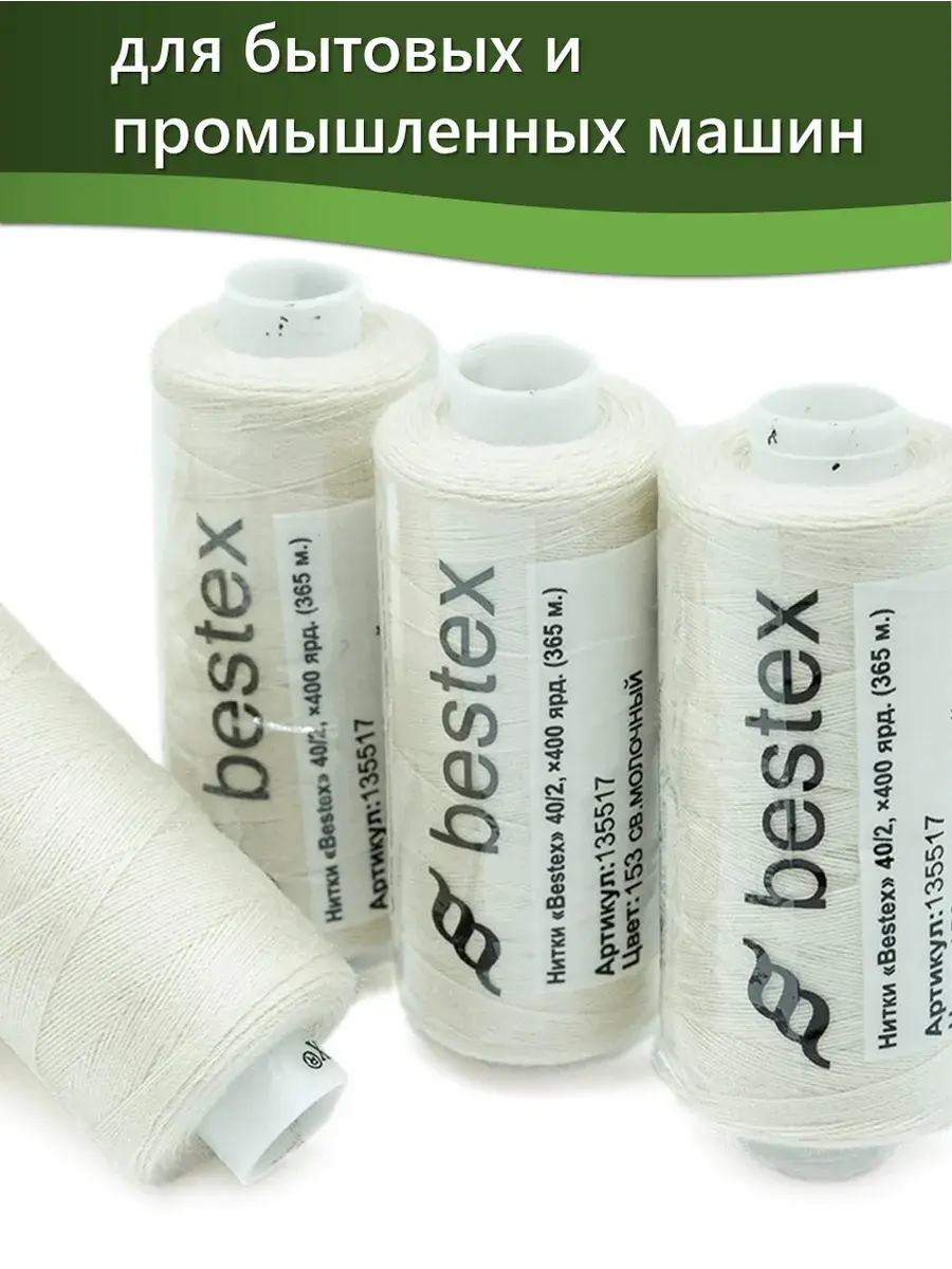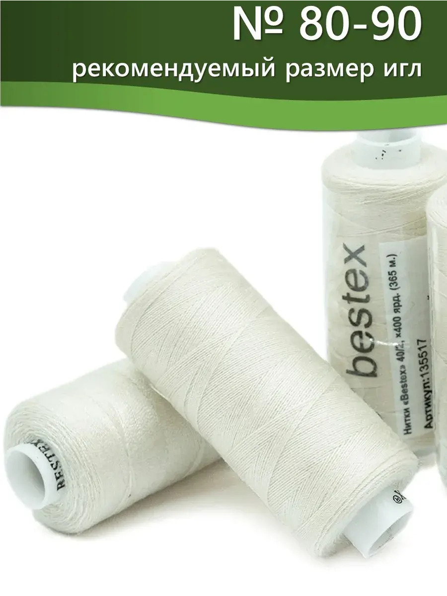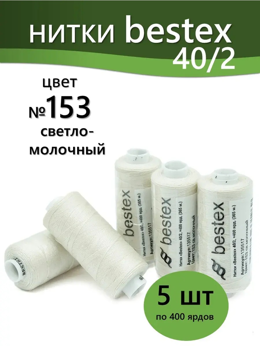 Набор ниток Bestex №40/2 – прекрасный вариант для шитья, ремонта текстильных изделий, рукоделия. Подойдут для бытовых и промышленных швейных машин. Изготовлены из 100 % полиэстера, прочные на разрыв и слегка эластичные, равномерные по толщине, имеют правостороннюю крутку. Обработаны силиконом на 3%, поэтому меньше разрываются при работе на высоких скоростях. Не истончаются и не теряют цвет после многократных стирок и от воздействия ультрафиолетовых лучей. Усадка минимальна, ворс и узелки почти не выражены. Нитки №40/2 подходят для работы с легкими тканями и тканями среднего веса. Назначение: – ремонт текстильных изделий, штопка вещей из трикотажа; – обработка срезов; – шитье вручную и на швейной машине. Линейная плотность: 14,8 x 2 текс. Разрывная нагрузка: 1050 сН. Рекомендуемый размер иглы: №80-90. В упаковке 5 бобин в намотке 400 ярдов.