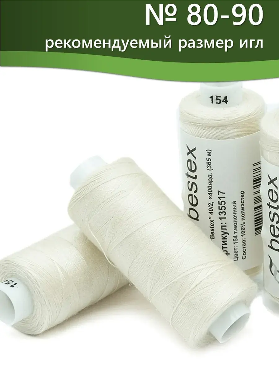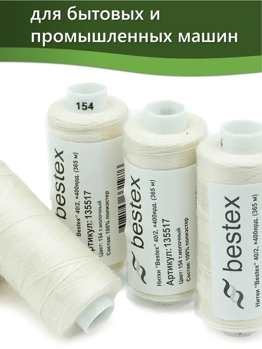 Набор ниток Bestex №40/2 – прекрасный вариант для шитья, ремонта текстильных изделий, рукоделия. Подойдут для бытовых и промышленных швейных машин. Изготовлены из 100 % полиэстера, прочные на разрыв и слегка эластичные, равномерные по толщине, имеют правостороннюю крутку. Обработаны силиконом на 3%, поэтому меньше разрываются при работе на высоких скоростях. Не истончаются и не теряют цвет после многократных стирок и от воздействия ультрафиолетовых лучей. Усадка минимальна, ворс и узелки почти не выражены. Нитки №40/2 подходят для работы с легкими тканями и тканями среднего веса. Назначение: – ремонт текстильных изделий, штопка вещей из трикотажа; – обработка срезов; – шитье вручную и на швейной машине. Линейная плотность: 14,8 x 2 текс. Разрывная нагрузка: 1050 сН. Рекомендуемый размер иглы: №80-90. В упаковке 5 бобин в намотке 400 ярдов.