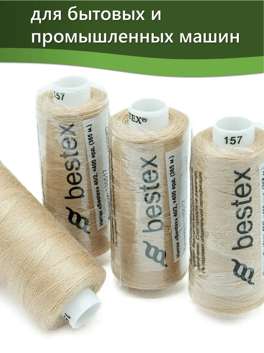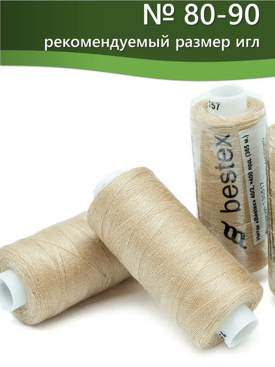 Набор ниток Bestex №40/2 – прекрасный вариант для шитья, ремонта текстильных изделий, рукоделия. Подойдут для бытовых и промышленных швейных машин. Изготовлены из 100 % полиэстера, прочные на разрыв и слегка эластичные, равномерные по толщине, имеют правостороннюю крутку. Обработаны силиконом на 3%, поэтому меньше разрываются при работе на высоких скоростях. Не истончаются и не теряют цвет после многократных стирок и от воздействия ультрафиолетовых лучей. Усадка минимальна, ворс и узелки почти не выражены. Нитки №40/2 подходят для работы с легкими тканями и тканями среднего веса. Назначение: – ремонт текстильных изделий, штопка вещей из трикотажа; – обработка срезов; – шитье вручную и на швейной машине. Линейная плотность: 14,8 x 2 текс. Разрывная нагрузка: 1050 сН. Рекомендуемый размер иглы: №80-90. В упаковке 5 бобин в намотке 400 ярдов.