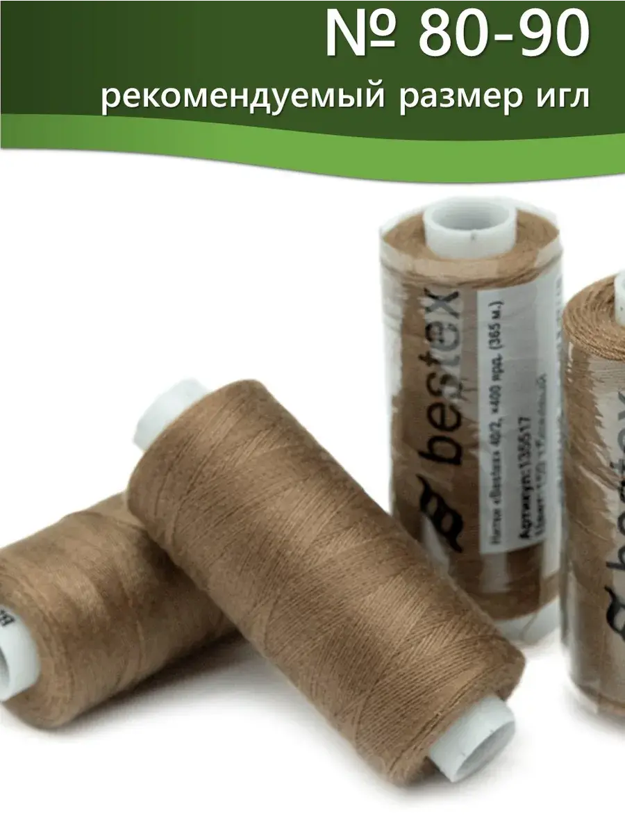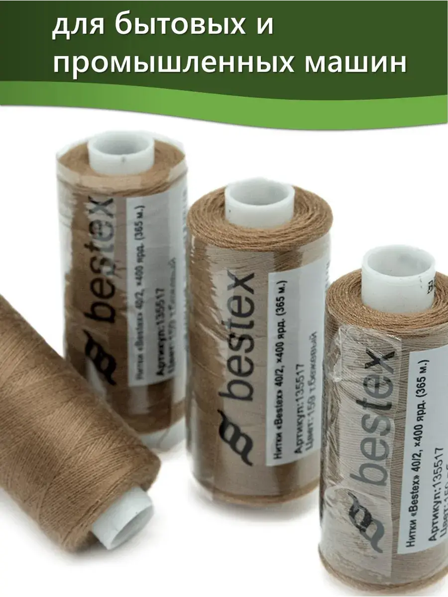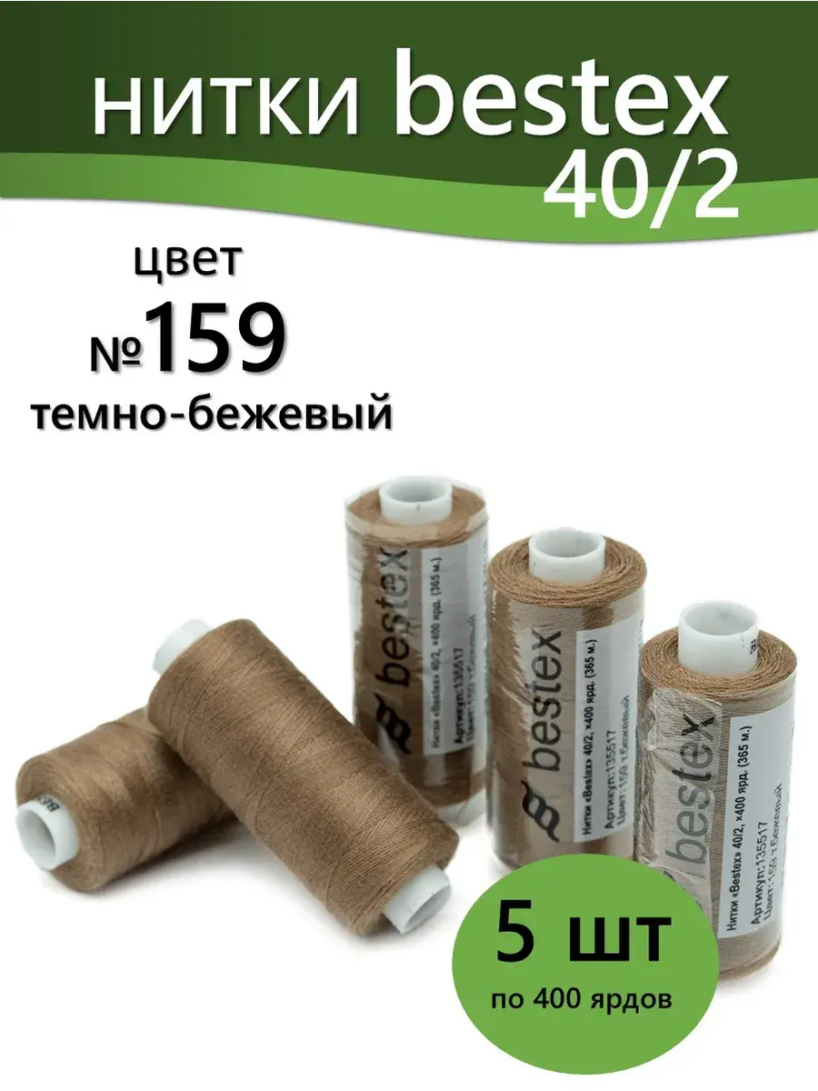Набор ниток Bestex №40/2 – прекрасный вариант для шитья, ремонта текстильных изделий, рукоделия. Подойдут для бытовых и промышленных швейных машин. Изготовлены из 100 % полиэстера, прочные на разрыв и слегка эластичные, равномерные по толщине, имеют правостороннюю крутку. Обработаны силиконом на 3%, поэтому меньше разрываются при работе на высоких скоростях. Не истончаются и не теряют цвет после многократных стирок и от воздействия ультрафиолетовых лучей. Усадка минимальна, ворс и узелки почти не выражены. Нитки №40/2 подходят для работы с легкими тканями и тканями среднего веса. Назначение: – ремонт текстильных изделий, штопка вещей из трикотажа; – обработка срезов; – шитье вручную и на швейной машине. Линейная плотность: 14,8 x 2 текс. Разрывная нагрузка: 1050 сН. Рекомендуемый размер иглы: №80-90. В упаковке 5 бобин в намотке 400 ярдов.