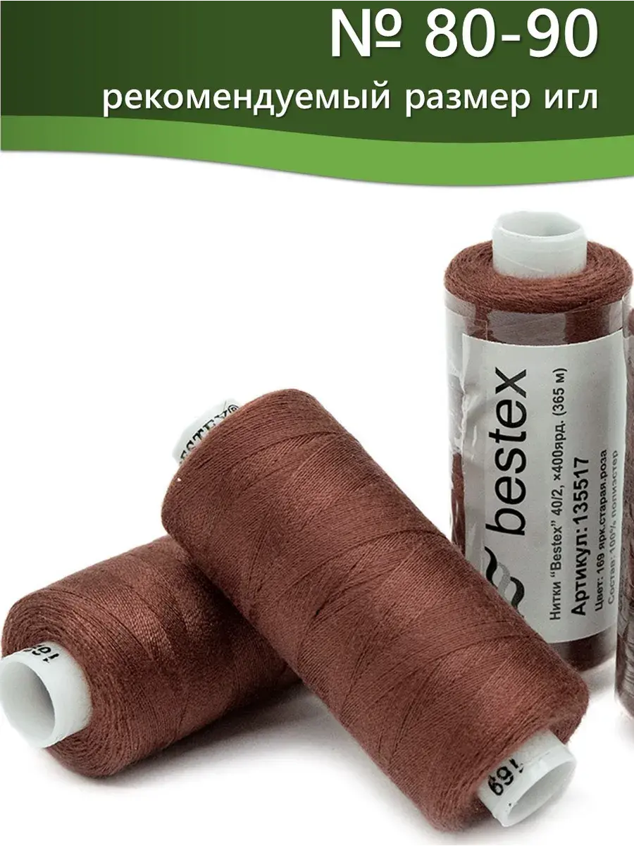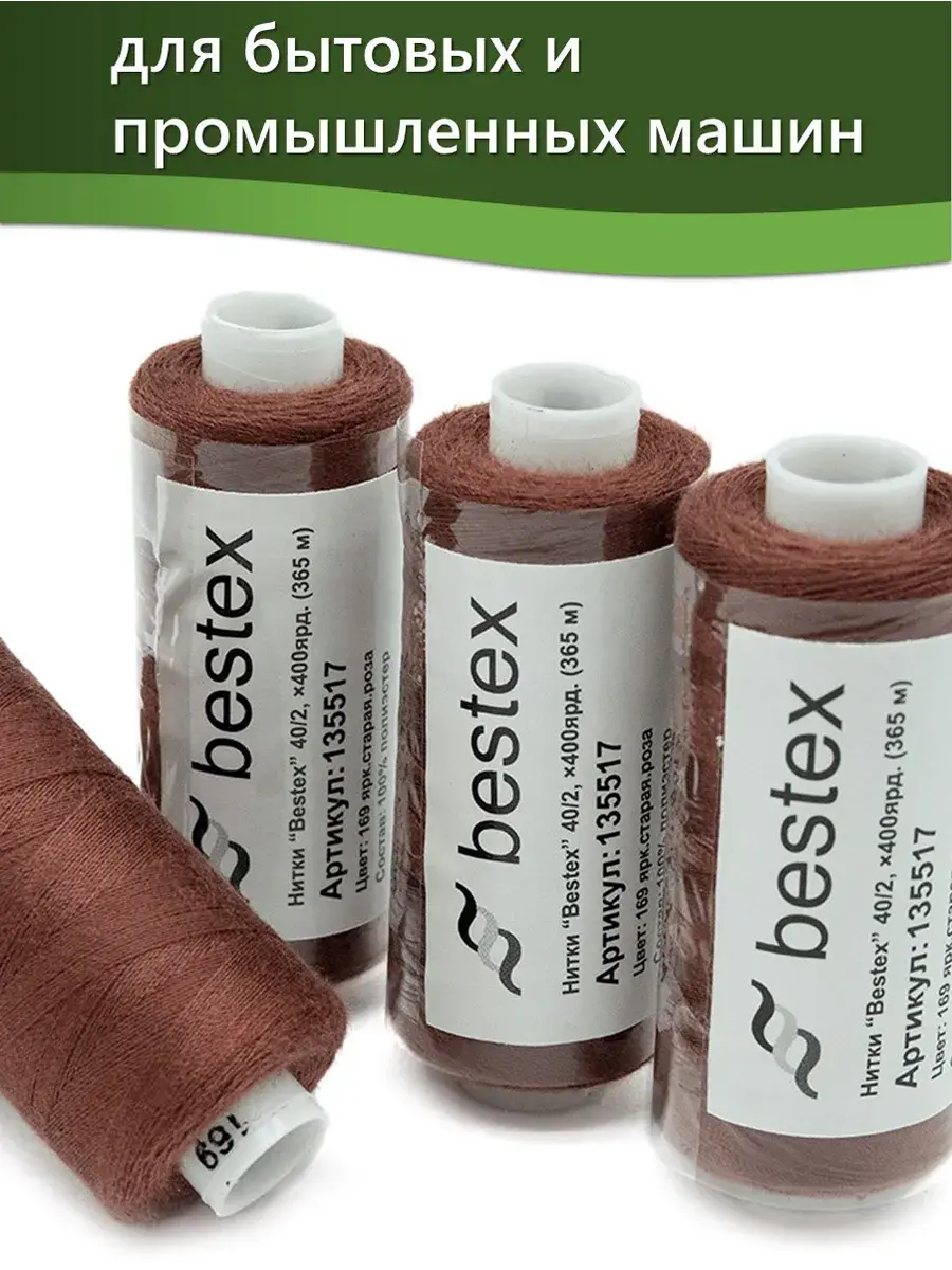 Набор ниток Bestex №40/2 – прекрасный вариант для шитья, ремонта текстильных изделий, рукоделия. Подойдут для бытовых и промышленных швейных машин. Изготовлены из 100 % полиэстера, прочные на разрыв и слегка эластичные, равномерные по толщине, имеют правостороннюю крутку. Обработаны силиконом на 3%, поэтому меньше разрываются при работе на высоких скоростях. Не истончаются и не теряют цвет после многократных стирок и от воздействия ультрафиолетовых лучей. Усадка минимальна, ворс и узелки почти не выражены. Нитки №40/2 подходят для работы с легкими тканями и тканями среднего веса. Назначение: – ремонт текстильных изделий, штопка вещей из трикотажа; – обработка срезов; – шитье вручную и на швейной машине. Линейная плотность: 14,8 x 2 текс. Разрывная нагрузка: 1050 сН. Рекомендуемый размер иглы: №80-90. В упаковке 5 бобин в намотке 400 ярдов.