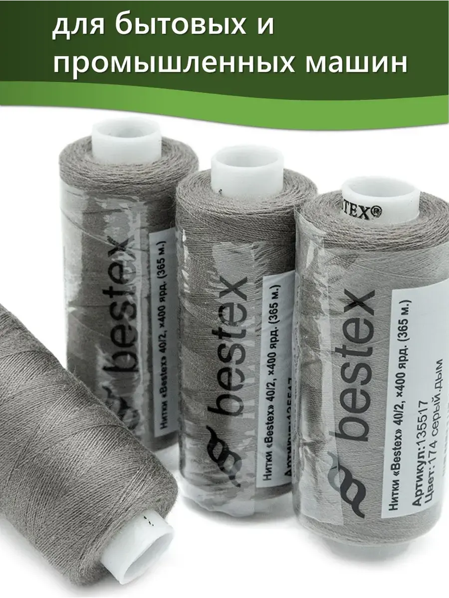 Набор ниток Bestex №40/2 – прекрасный вариант для шитья, ремонта текстильных изделий, рукоделия. Подойдут для бытовых и промышленных швейных машин. Изготовлены из 100 % полиэстера, прочные на разрыв и слегка эластичные, равномерные по толщине, имеют правостороннюю крутку. Обработаны силиконом на 3%, поэтому меньше разрываются при работе на высоких скоростях. Не истончаются и не теряют цвет после многократных стирок и от воздействия ультрафиолетовых лучей. Усадка минимальна, ворс и узелки почти не выражены. Нитки №40/2 подходят для работы с легкими тканями и тканями среднего веса. Назначение: – ремонт текстильных изделий, штопка вещей из трикотажа; – обработка срезов; – шитье вручную и на швейной машине. Линейная плотность: 14,8 x 2 текс. Разрывная нагрузка: 1050 сН. Рекомендуемый размер иглы: №80-90. В упаковке 5 бобин в намотке 400 ярдов.