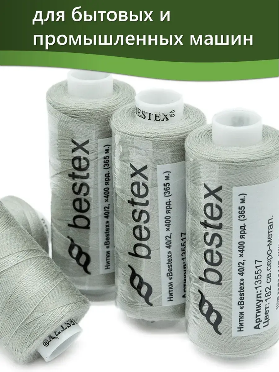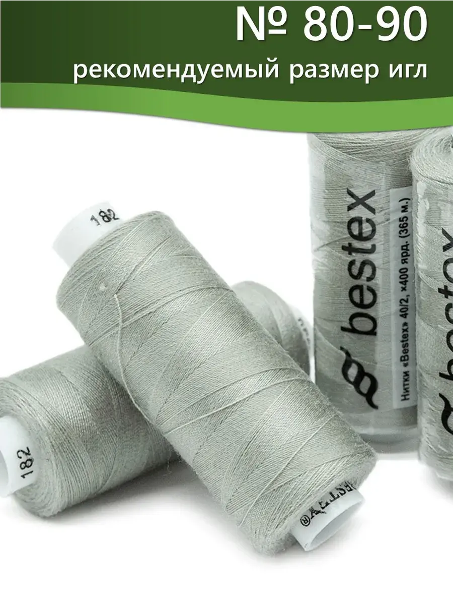 Набор ниток Bestex №40/2 – прекрасный вариант для шитья, ремонта текстильных изделий, рукоделия. Подойдут для бытовых и промышленных швейных машин. Изготовлены из 100 % полиэстера, прочные на разрыв и слегка эластичные, равномерные по толщине, имеют правостороннюю крутку. Обработаны силиконом на 3%, поэтому меньше разрываются при работе на высоких скоростях. Не истончаются и не теряют цвет после многократных стирок и от воздействия ультрафиолетовых лучей. Усадка минимальна, ворс и узелки почти не выражены. Нитки №40/2 подходят для работы с легкими тканями и тканями среднего веса. Назначение: – ремонт текстильных изделий, штопка вещей из трикотажа; – обработка срезов; – шитье вручную и на швейной машине. Линейная плотность: 14,8 x 2 текс. Разрывная нагрузка: 1050 сН. Рекомендуемый размер иглы: №80-90. В упаковке 5 бобин в намотке 400 ярдов.