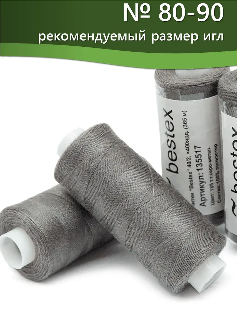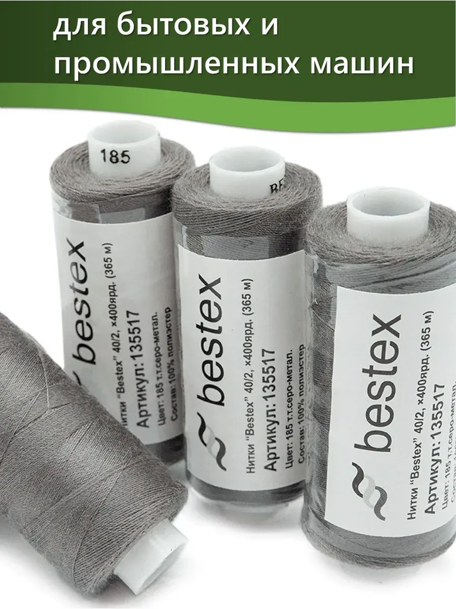 Набор ниток Bestex №40/2 – прекрасный вариант для шитья, ремонта текстильных изделий, рукоделия. Подойдут для бытовых и промышленных швейных машин. Изготовлены из 100 % полиэстера, прочные на разрыв и слегка эластичные, равномерные по толщине, имеют правостороннюю крутку. Обработаны силиконом на 3%, поэтому меньше разрываются при работе на высоких скоростях. Не истончаются и не теряют цвет после многократных стирок и от воздействия ультрафиолетовых лучей. Усадка минимальна, ворс и узелки почти не выражены. Нитки №40/2 подходят для работы с легкими тканями и тканями среднего веса. Назначение: – ремонт текстильных изделий, штопка вещей из трикотажа; – обработка срезов; – шитье вручную и на швейной машине. Линейная плотность: 14,8 x 2 текс. Разрывная нагрузка: 1050 сН. Рекомендуемый размер иглы: №80-90. В упаковке 5 бобин в намотке 400 ярдов.
