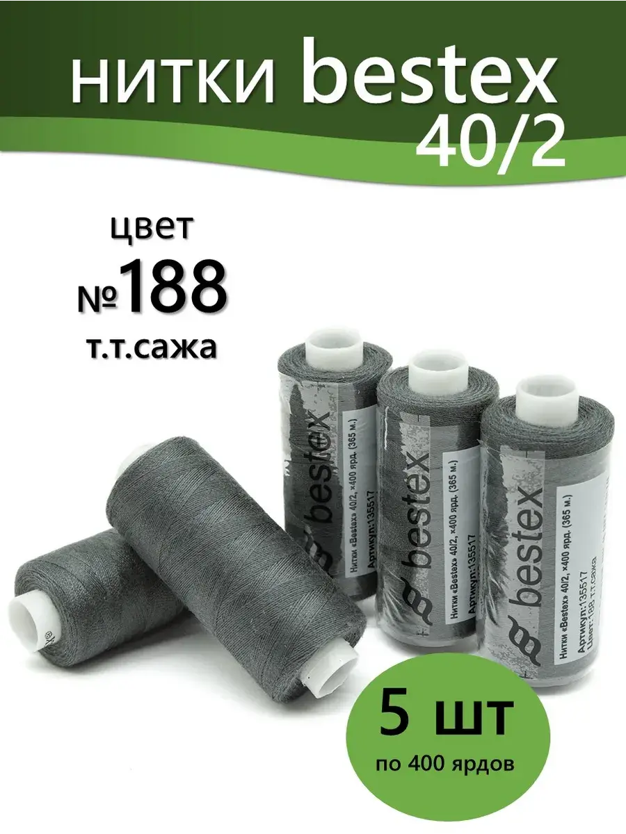 Набор ниток Bestex №40/2 – прекрасный вариант для шитья, ремонта текстильных изделий, рукоделия. Подойдут для бытовых и промышленных швейных машин. Изготовлены из 100 % полиэстера, прочные на разрыв и слегка эластичные, равномерные по толщине, имеют правостороннюю крутку. Обработаны силиконом на 3%, поэтому меньше разрываются при работе на высоких скоростях. Не истончаются и не теряют цвет после многократных стирок и от воздействия ультрафиолетовых лучей. Усадка минимальна, ворс и узелки почти не выражены. Нитки №40/2 подходят для работы с легкими тканями и тканями среднего веса. Назначение: – ремонт текстильных изделий, штопка вещей из трикотажа; – обработка срезов; – шитье вручную и на швейной машине. Линейная плотность: 14,8 x 2 текс. Разрывная нагрузка: 1050 сН. Рекомендуемый размер иглы: №80-90. В упаковке 5 бобин в намотке 400 ярдов.