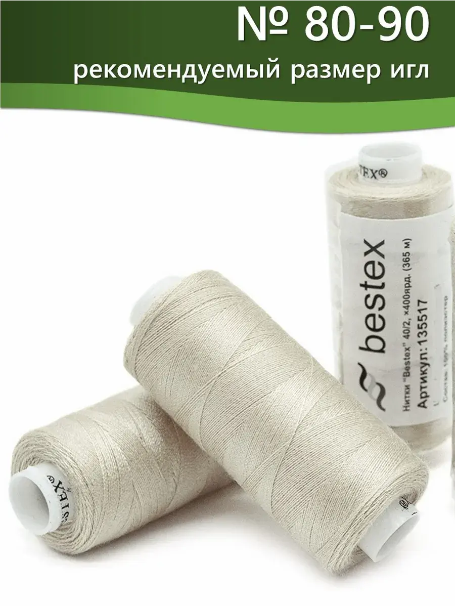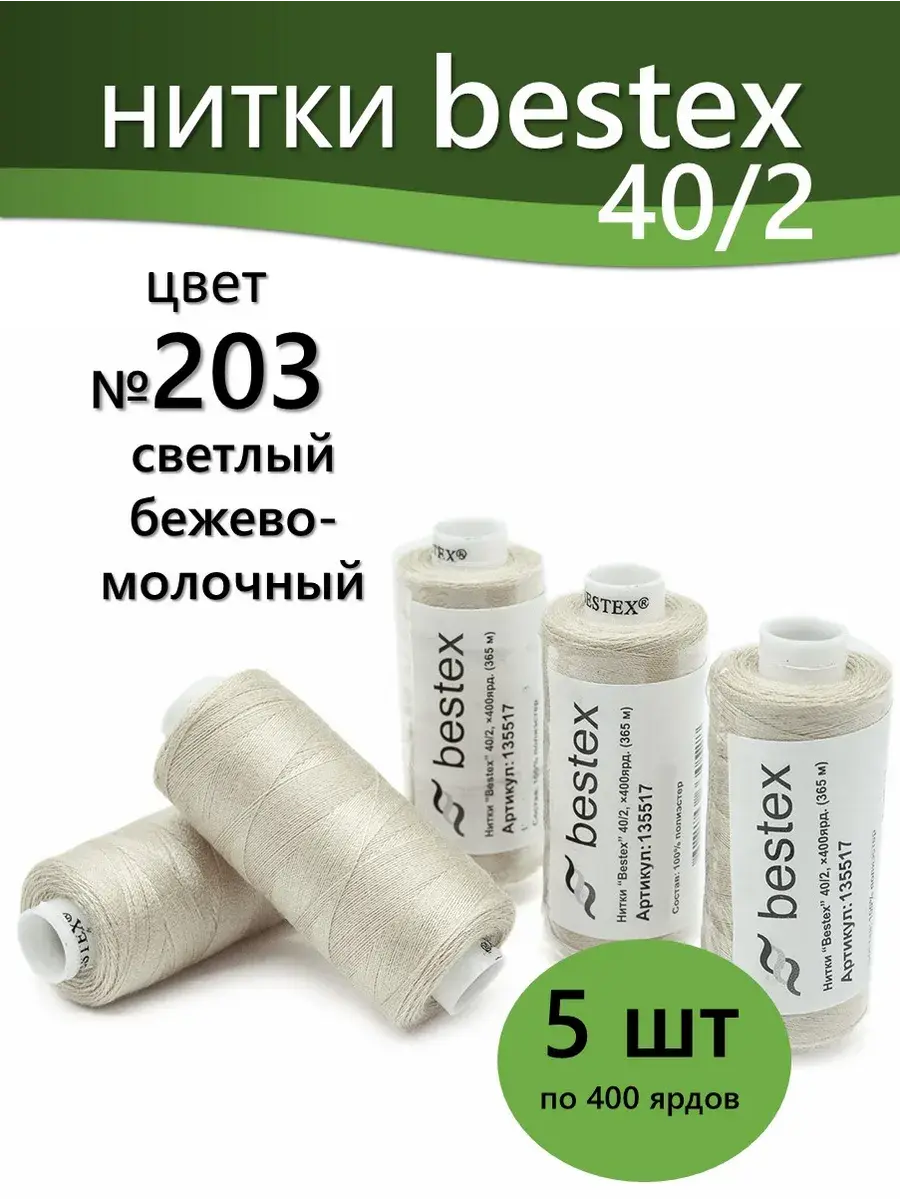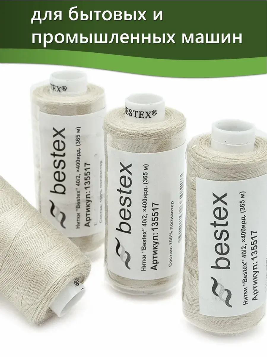 Набор ниток Bestex №40/2 – прекрасный вариант для шитья, ремонта текстильных изделий, рукоделия. Подойдут для бытовых и промышленных швейных машин. Изготовлены из 100 % полиэстера, прочные на разрыв и слегка эластичные, равномерные по толщине, имеют правостороннюю крутку. Обработаны силиконом на 3%, поэтому меньше разрываются при работе на высоких скоростях. Не истончаются и не теряют цвет после многократных стирок и от воздействия ультрафиолетовых лучей. Усадка минимальна, ворс и узелки почти не выражены. Нитки №40/2 подходят для работы с легкими тканями и тканями среднего веса. Назначение: – ремонт текстильных изделий, штопка вещей из трикотажа; – обработка срезов; – шитье вручную и на швейной машине. Линейная плотность: 14,8 x 2 текс. Разрывная нагрузка: 1050 сН. Рекомендуемый размер иглы: №80-90. В упаковке 5 бобин в намотке 400 ярдов.