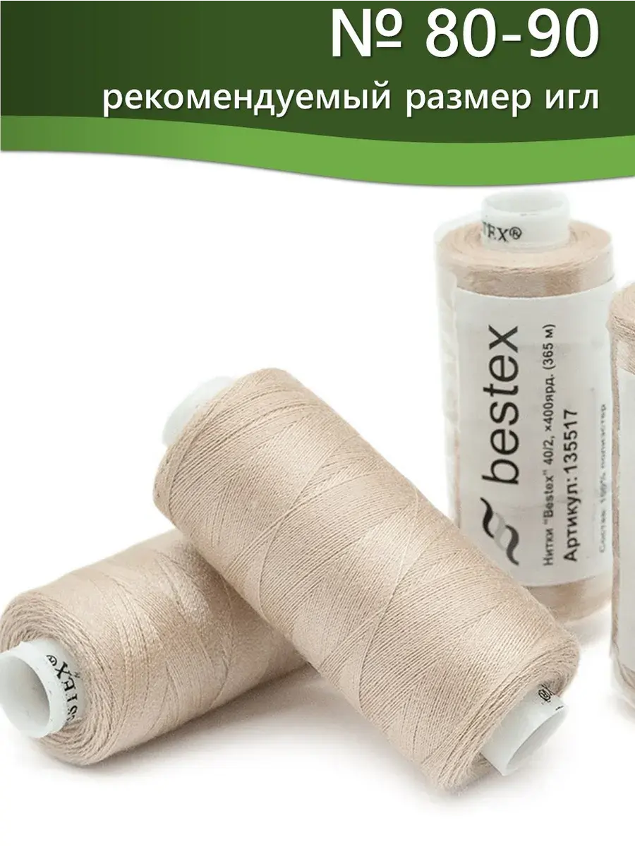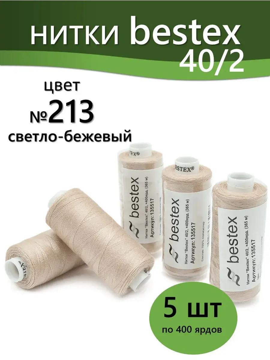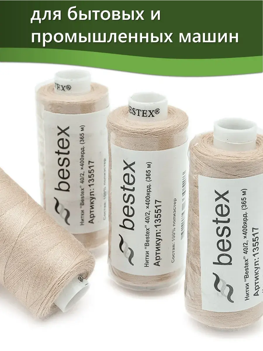 Набор ниток Bestex №40/2 – прекрасный вариант для шитья, ремонта текстильных изделий, рукоделия. Подойдут для бытовых и промышленных швейных машин. Изготовлены из 100 % полиэстера, прочные на разрыв и слегка эластичные, равномерные по толщине, имеют правостороннюю крутку. Обработаны силиконом на 3%, поэтому меньше разрываются при работе на высоких скоростях. Не истончаются и не теряют цвет после многократных стирок и от воздействия ультрафиолетовых лучей. Усадка минимальна, ворс и узелки почти не выражены. Нитки №40/2 подходят для работы с легкими тканями и тканями среднего веса. Назначение: – ремонт текстильных изделий, штопка вещей из трикотажа; – обработка срезов; – шитье вручную и на швейной машине. Линейная плотность: 14,8 x 2 текс. Разрывная нагрузка: 1050 сН. Рекомендуемый размер иглы: №80-90. В упаковке 5 бобин в намотке 400 ярдов.