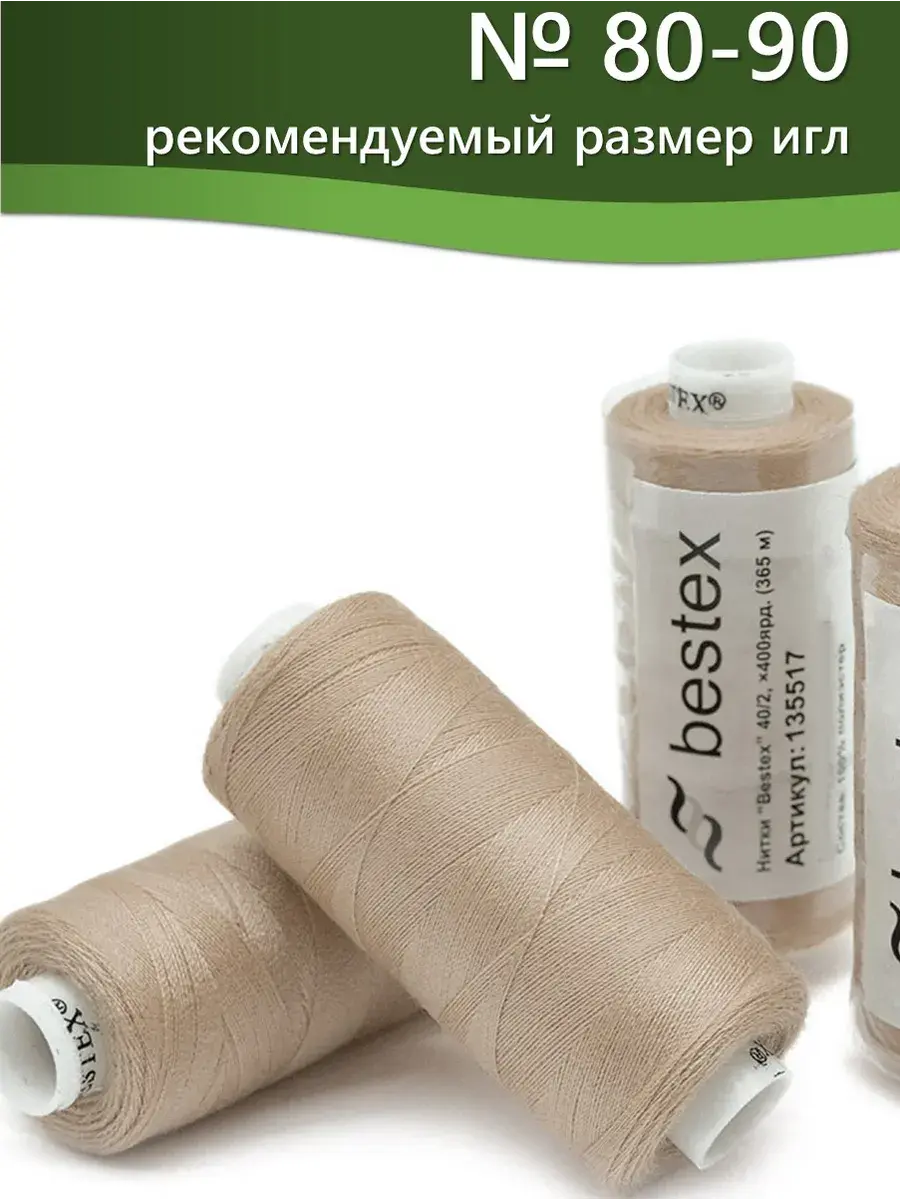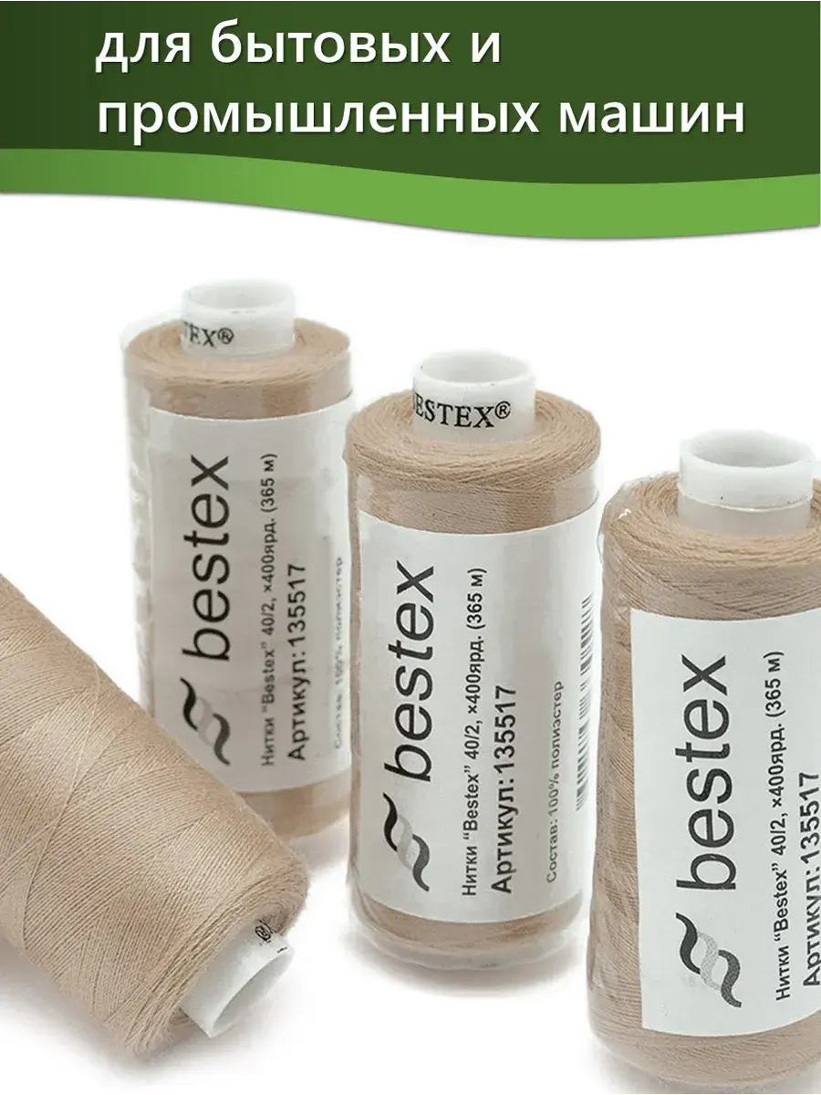 Набор ниток Bestex №40/2 – прекрасный вариант для шитья, ремонта текстильных изделий, рукоделия. Подойдут для бытовых и промышленных швейных машин. Изготовлены из 100 % полиэстера, прочные на разрыв и слегка эластичные, равномерные по толщине, имеют правостороннюю крутку. Обработаны силиконом на 3%, поэтому меньше разрываются при работе на высоких скоростях. Не истончаются и не теряют цвет после многократных стирок и от воздействия ультрафиолетовых лучей. Усадка минимальна, ворс и узелки почти не выражены. Нитки №40/2 подходят для работы с легкими тканями и тканями среднего веса. Назначение: – ремонт текстильных изделий, штопка вещей из трикотажа; – обработка срезов; – шитье вручную и на швейной машине. Линейная плотность: 14,8 x 2 текс. Разрывная нагрузка: 1050 сН. Рекомендуемый размер иглы: №80-90. В упаковке 5 бобин в намотке 400 ярдов.
