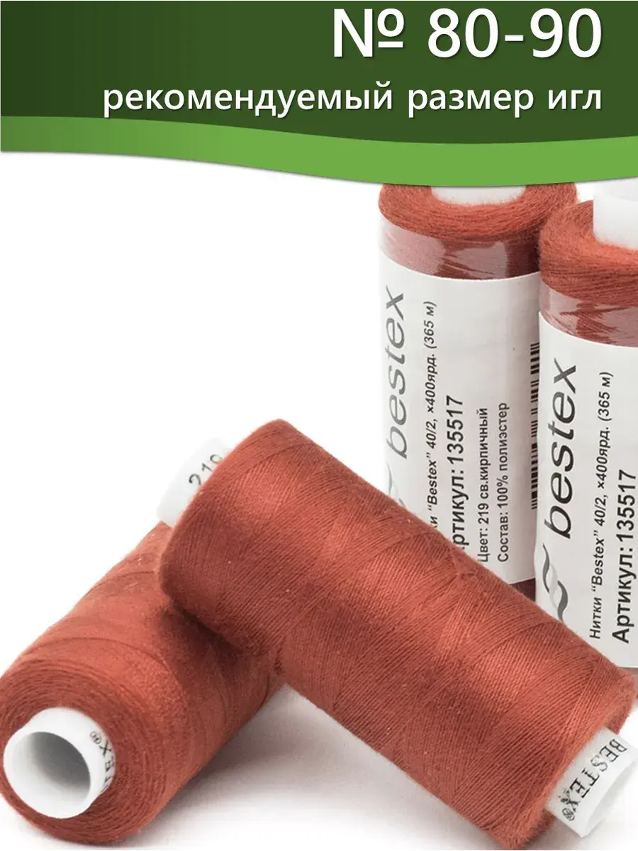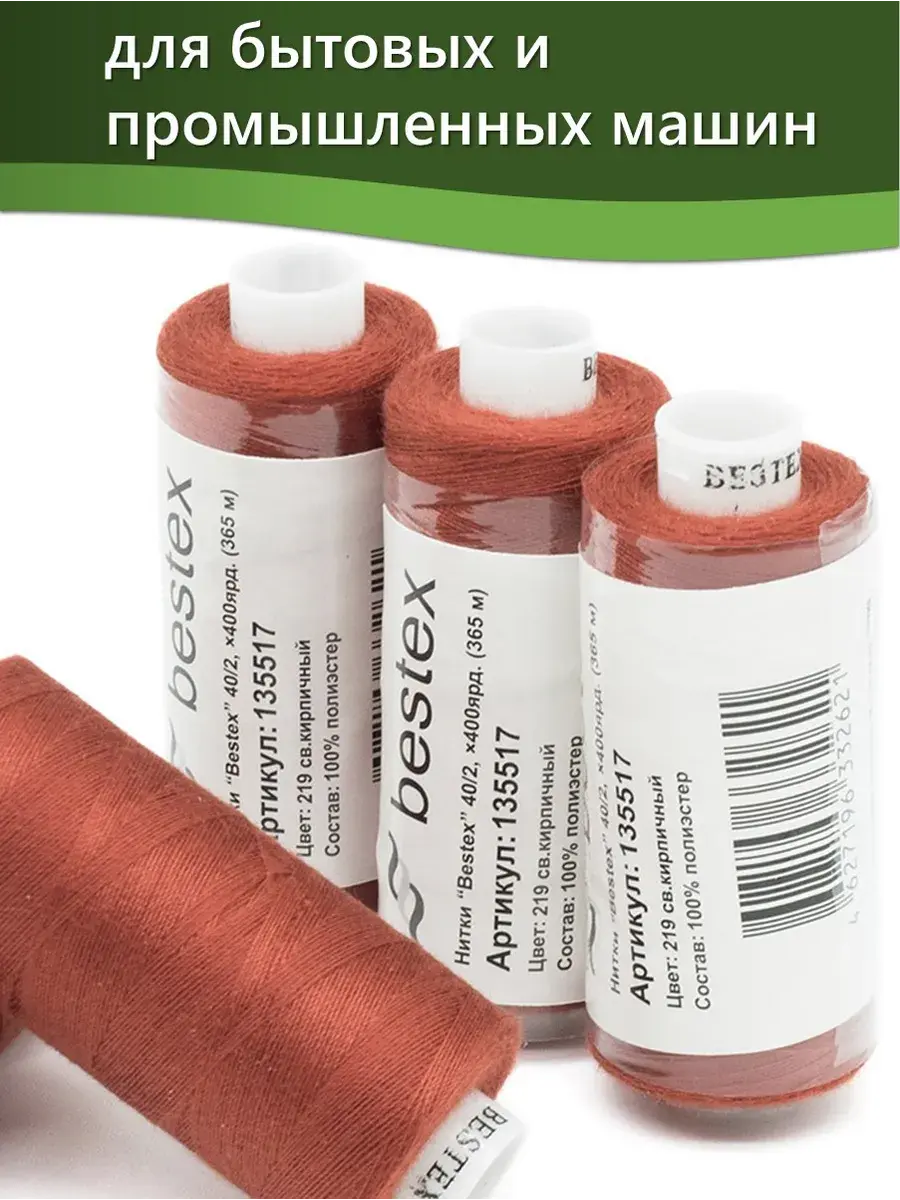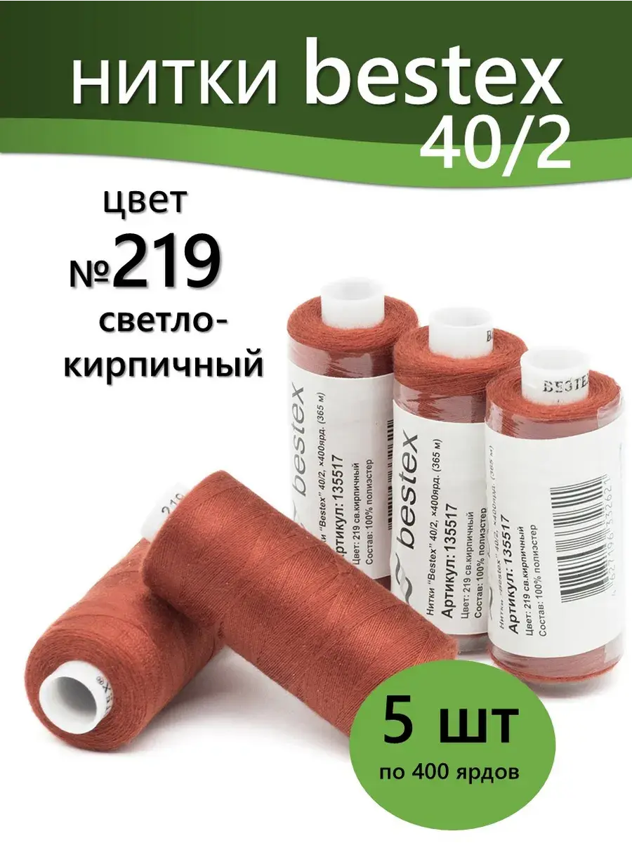 Набор ниток Bestex №40/2 – прекрасный вариант для шитья, ремонта текстильных изделий, рукоделия. Подойдут для бытовых и промышленных швейных машин. Изготовлены из 100 % полиэстера, прочные на разрыв и слегка эластичные, равномерные по толщине, имеют правостороннюю крутку. Обработаны силиконом на 3%, поэтому меньше разрываются при работе на высоких скоростях. Не истончаются и не теряют цвет после многократных стирок и от воздействия ультрафиолетовых лучей. Усадка минимальна, ворс и узелки почти не выражены. Нитки №40/2 подходят для работы с легкими тканями и тканями среднего веса. Назначение: – ремонт текстильных изделий, штопка вещей из трикотажа; – обработка срезов; – шитье вручную и на швейной машине. Линейная плотность: 14,8 x 2 текс. Разрывная нагрузка: 1050 сН. Рекомендуемый размер иглы: №80-90. В упаковке 5 бобин в намотке 400 ярдов.