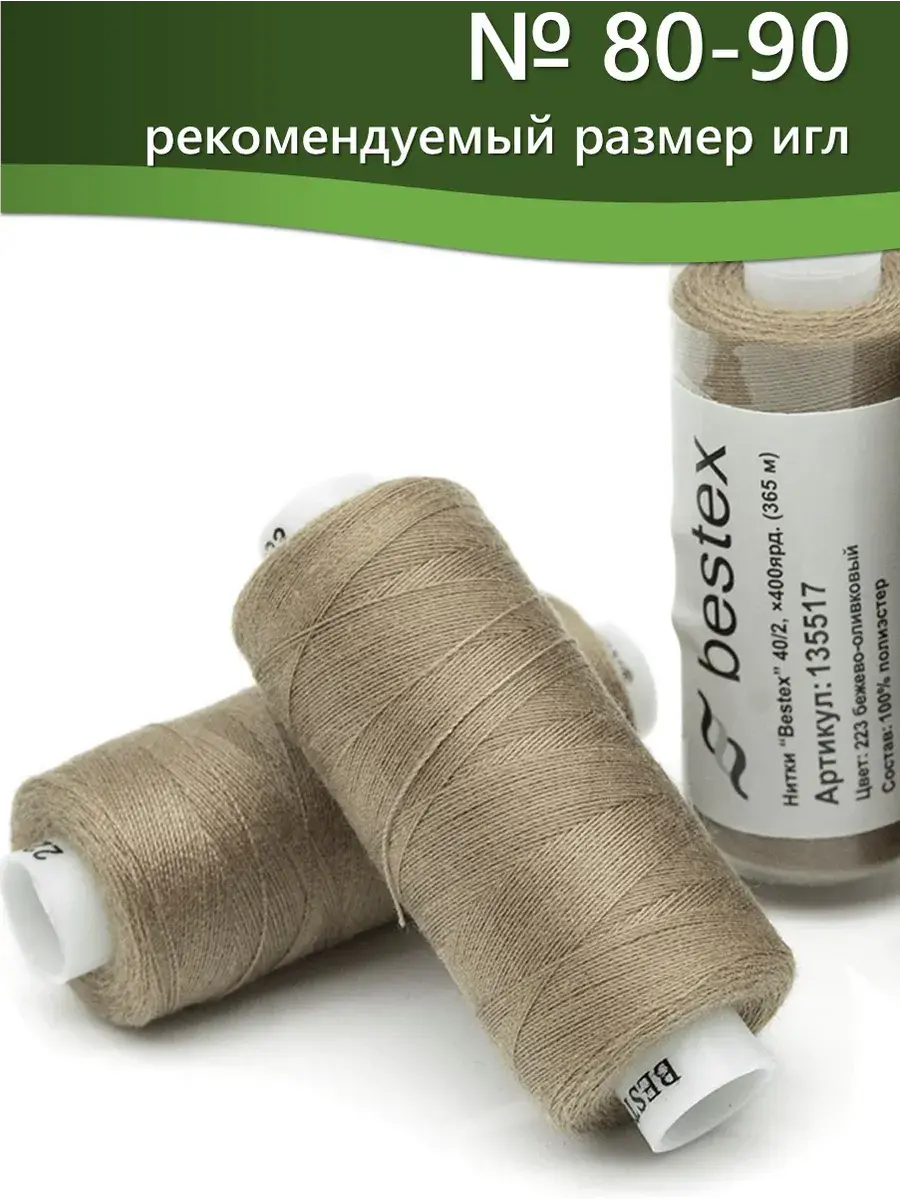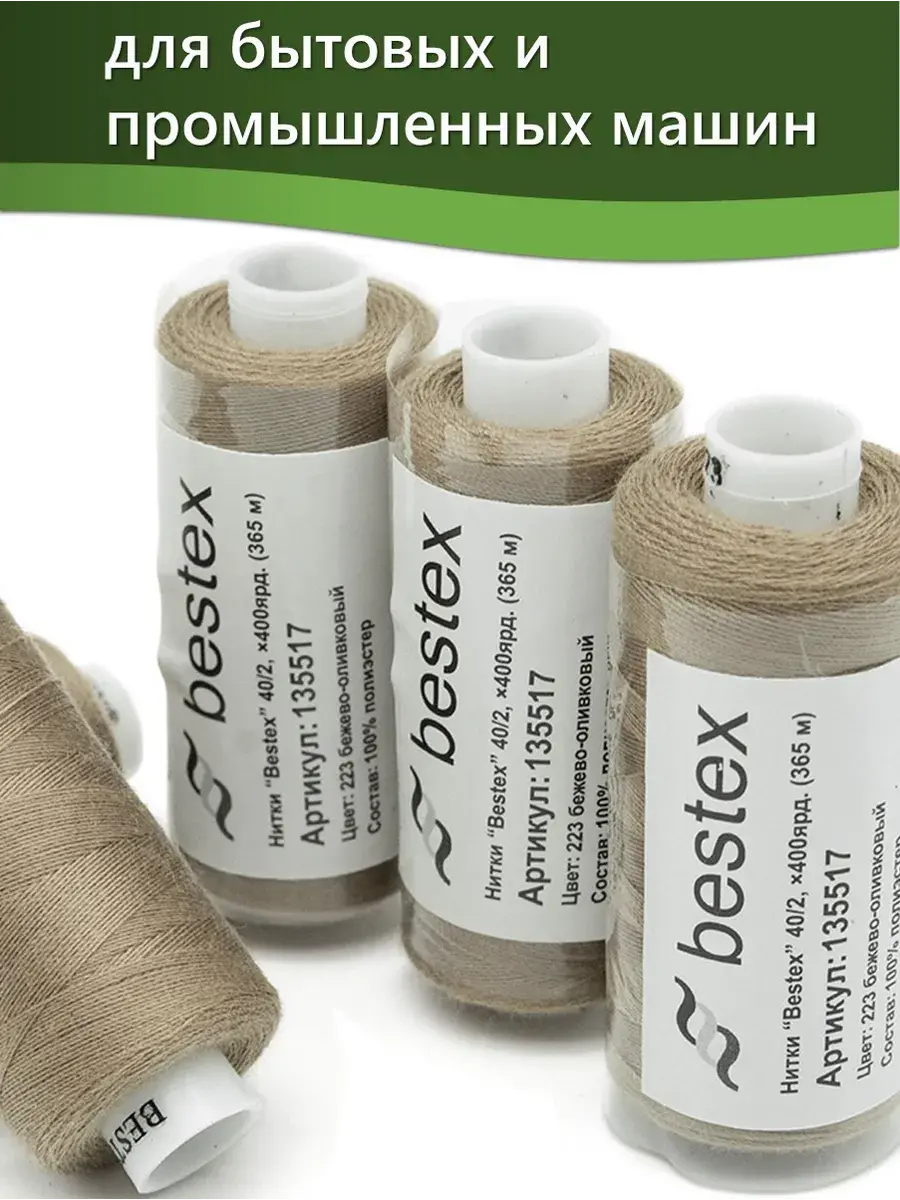 Набор ниток Bestex №40/2 – прекрасный вариант для шитья, ремонта текстильных изделий, рукоделия. Подойдут для бытовых и промышленных швейных машин. Изготовлены из 100 % полиэстера, прочные на разрыв и слегка эластичные, равномерные по толщине, имеют правостороннюю крутку. Обработаны силиконом на 3%, поэтому меньше разрываются при работе на высоких скоростях. Не истончаются и не теряют цвет после многократных стирок и от воздействия ультрафиолетовых лучей. Усадка минимальна, ворс и узелки почти не выражены. Нитки №40/2 подходят для работы с легкими тканями и тканями среднего веса. Назначение: – ремонт текстильных изделий, штопка вещей из трикотажа; – обработка срезов; – шитье вручную и на швейной машине. Линейная плотность: 14,8 x 2 текс. Разрывная нагрузка: 1050 сН. Рекомендуемый размер иглы: №80-90. В упаковке 5 бобин в намотке 400 ярдов.