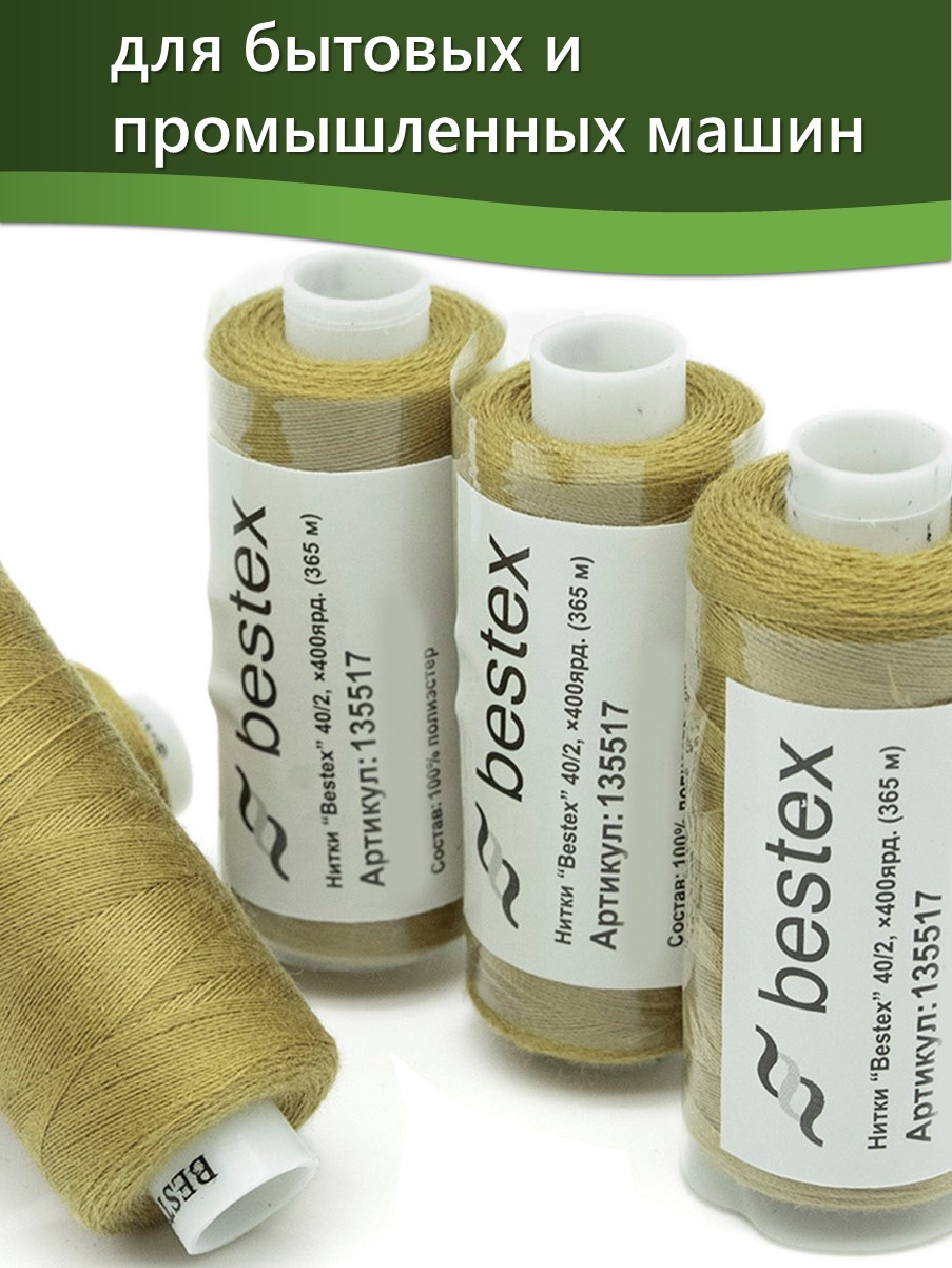 Набор ниток Bestex №40/2 – прекрасный вариант для шитья, ремонта текстильных изделий, рукоделия. Подойдут для бытовых и промышленных швейных машин. Изготовлены из 100 % полиэстера, прочные на разрыв и слегка эластичные, равномерные по толщине, имеют правостороннюю крутку. Обработаны силиконом на 3%, поэтому меньше разрываются при работе на высоких скоростях. Не истончаются и не теряют цвет после многократных стирок и от воздействия ультрафиолетовых лучей. Усадка минимальна, ворс и узелки почти не выражены. Нитки №40/2 подходят для работы с легкими тканями и тканями среднего веса. Назначение: – ремонт текстильных изделий, штопка вещей из трикотажа; – обработка срезов; – шитье вручную и на швейной машине. Линейная плотность: 14,8 x 2 текс. Разрывная нагрузка: 1050 сН. Рекомендуемый размер иглы: №80-90. В упаковке 5 бобин в намотке 400 ярдов.