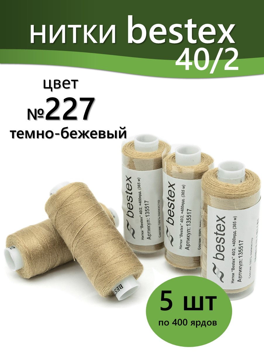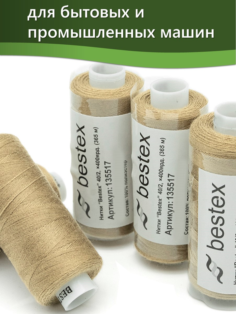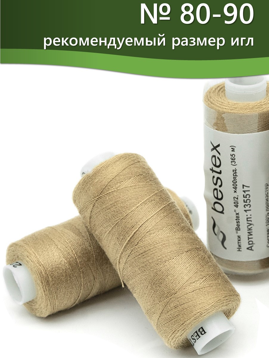 Набор ниток Bestex №40/2 – прекрасный вариант для шитья, ремонта текстильных изделий, рукоделия. Подойдут для бытовых и промышленных швейных машин. Изготовлены из 100 % полиэстера, прочные на разрыв и слегка эластичные, равномерные по толщине, имеют правостороннюю крутку. Обработаны силиконом на 3%, поэтому меньше разрываются при работе на высоких скоростях. Не истончаются и не теряют цвет после многократных стирок и от воздействия ультрафиолетовых лучей. Усадка минимальна, ворс и узелки почти не выражены. Нитки №40/2 подходят для работы с легкими тканями и тканями среднего веса. Назначение: – ремонт текстильных изделий, штопка вещей из трикотажа; – обработка срезов; – шитье вручную и на швейной машине. Линейная плотность: 14,8 x 2 текс. Разрывная нагрузка: 1050 сН. Рекомендуемый размер иглы: №80-90. В упаковке 5 бобин в намотке 400 ярдов.