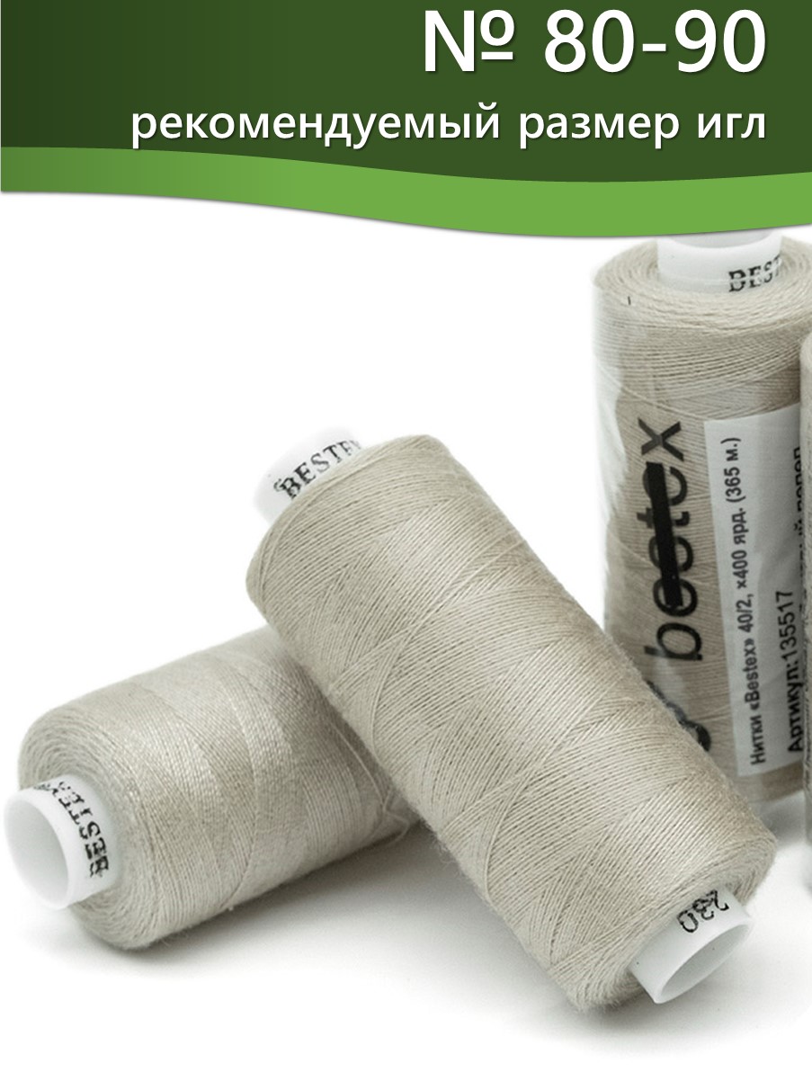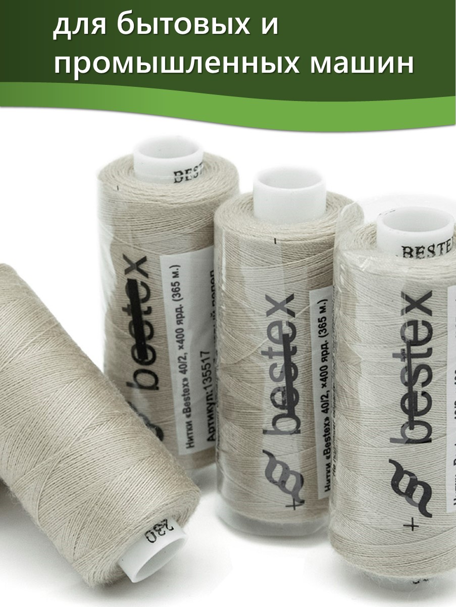Набор ниток Bestex №40/2 – прекрасный вариант для шитья, ремонта текстильных изделий, рукоделия. Подойдут для бытовых и промышленных швейных машин. Изготовлены из 100 % полиэстера, прочные на разрыв и слегка эластичные, равномерные по толщине, имеют правостороннюю крутку. Обработаны силиконом на 3%, поэтому меньше разрываются при работе на высоких скоростях. Не истончаются и не теряют цвет после многократных стирок и от воздействия ультрафиолетовых лучей. Усадка минимальна, ворс и узелки почти не выражены. Нитки №40/2 подходят для работы с легкими тканями и тканями среднего веса. Назначение: – ремонт текстильных изделий, штопка вещей из трикотажа; – обработка срезов; – шитье вручную и на швейной машине. Линейная плотность: 14,8 x 2 текс. Разрывная нагрузка: 1050 сН. Рекомендуемый размер иглы: №80-90. В упаковке 5 бобин в намотке 400 ярдов.
