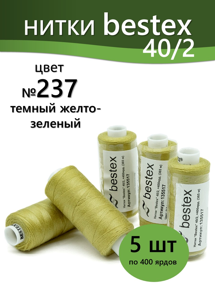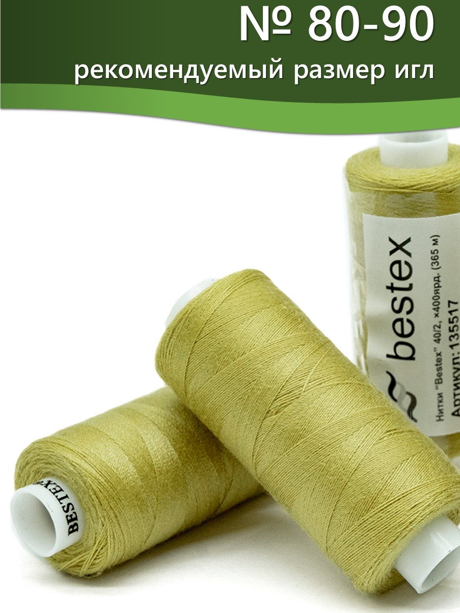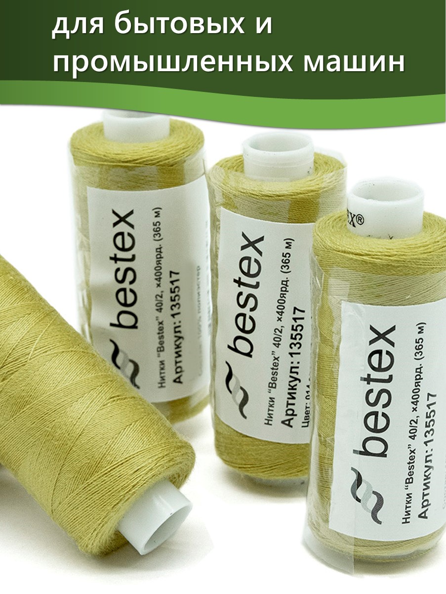 Набор ниток Bestex №40/2 – прекрасный вариант для шитья, ремонта текстильных изделий, рукоделия. Подойдут для бытовых и промышленных швейных машин. Изготовлены из 100 % полиэстера, прочные на разрыв и слегка эластичные, равномерные по толщине, имеют правостороннюю крутку. Обработаны силиконом на 3%, поэтому меньше разрываются при работе на высоких скоростях. Не истончаются и не теряют цвет после многократных стирок и от воздействия ультрафиолетовых лучей. Усадка минимальна, ворс и узелки почти не выражены. Нитки №40/2 подходят для работы с легкими тканями и тканями среднего веса. Назначение: – ремонт текстильных изделий, штопка вещей из трикотажа; – обработка срезов; – шитье вручную и на швейной машине. Линейная плотность: 14,8 x 2 текс. Разрывная нагрузка: 1050 сН. Рекомендуемый размер иглы: №80-90. В упаковке 5 бобин в намотке 400 ярдов.