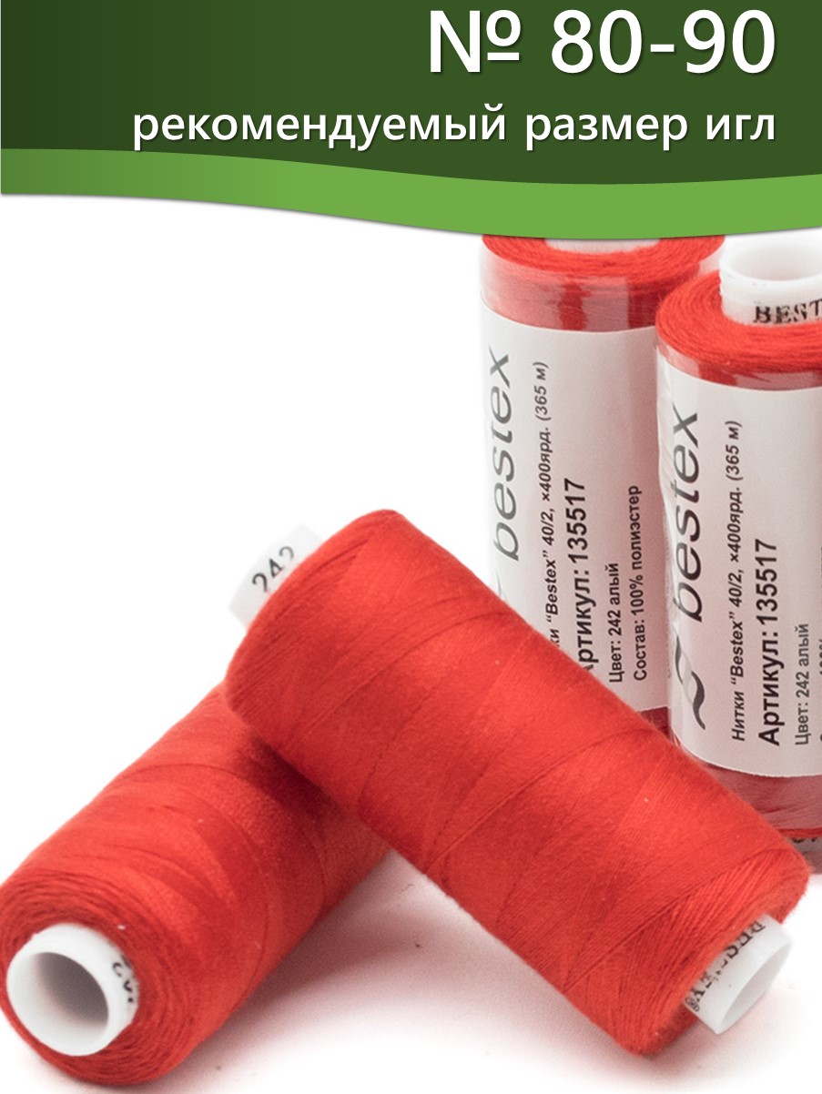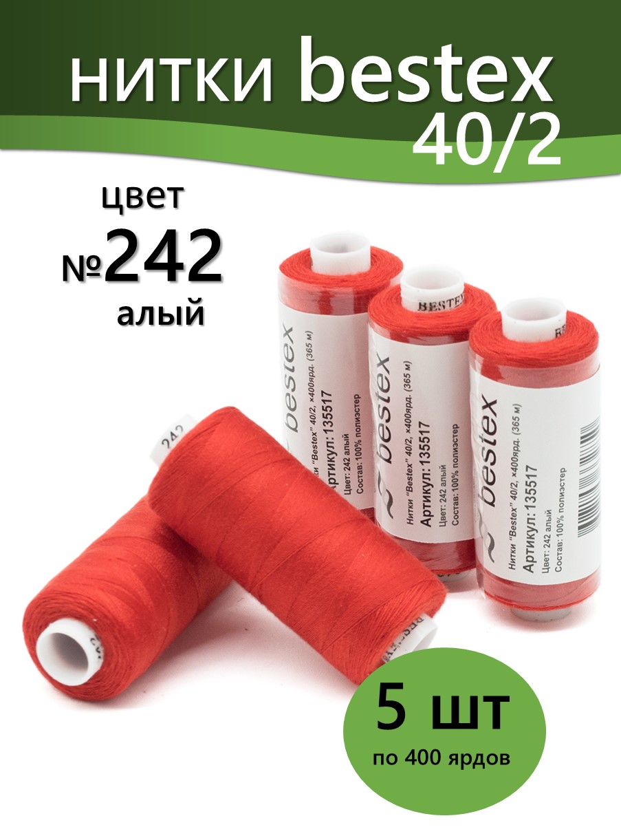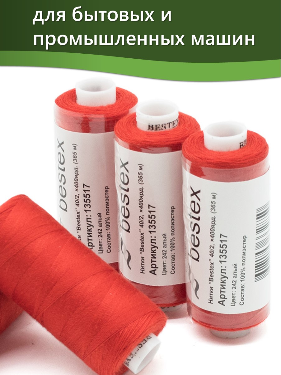 Набор ниток Bestex №40/2 – прекрасный вариант для шитья, ремонта текстильных изделий, рукоделия. Подойдут для бытовых и промышленных швейных машин. Изготовлены из 100 % полиэстера, прочные на разрыв и слегка эластичные, равномерные по толщине, имеют правостороннюю крутку. Обработаны силиконом на 3%, поэтому меньше разрываются при работе на высоких скоростях. Не истончаются и не теряют цвет после многократных стирок и от воздействия ультрафиолетовых лучей. Усадка минимальна, ворс и узелки почти не выражены. Нитки №40/2 подходят для работы с легкими тканями и тканями среднего веса. Назначение: – ремонт текстильных изделий, штопка вещей из трикотажа; – обработка срезов; – шитье вручную и на швейной машине. Линейная плотность: 14,8 x 2 текс. Разрывная нагрузка: 1050 сН. Рекомендуемый размер иглы: №80-90. В упаковке 5 бобин в намотке 400 ярдов.