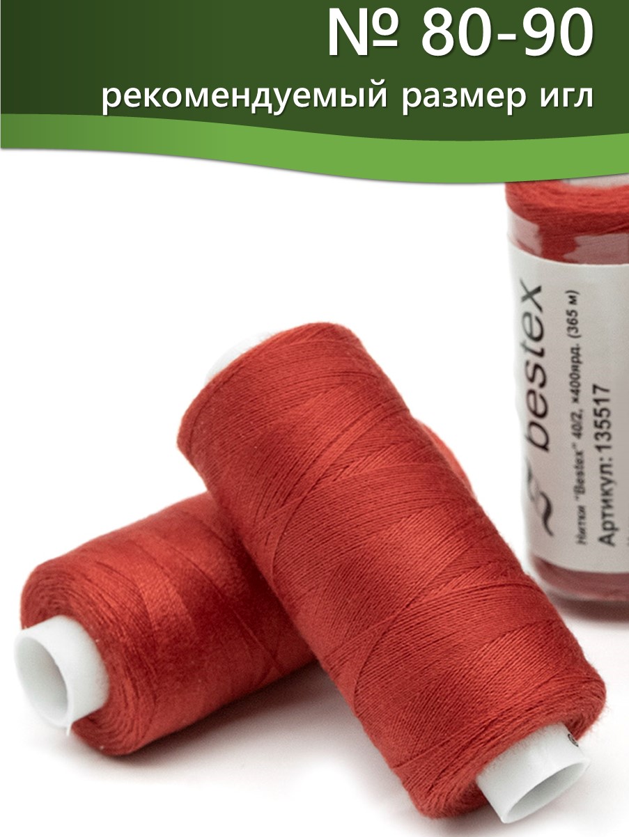 Набор ниток Bestex №40/2 – прекрасный вариант для шитья, ремонта текстильных изделий, рукоделия. Подойдут для бытовых и промышленных швейных машин. Изготовлены из 100 % полиэстера, прочные на разрыв и слегка эластичные, равномерные по толщине, имеют правостороннюю крутку. Обработаны силиконом на 3%, поэтому меньше разрываются при работе на высоких скоростях. Не истончаются и не теряют цвет после многократных стирок и от воздействия ультрафиолетовых лучей. Усадка минимальна, ворс и узелки почти не выражены. Нитки №40/2 подходят для работы с легкими тканями и тканями среднего веса. Назначение: – ремонт текстильных изделий, штопка вещей из трикотажа; – обработка срезов; – шитье вручную и на швейной машине. Линейная плотность: 14,8 x 2 текс. Разрывная нагрузка: 1050 сН. Рекомендуемый размер иглы: №80-90. В упаковке 5 бобин в намотке 400 ярдов.