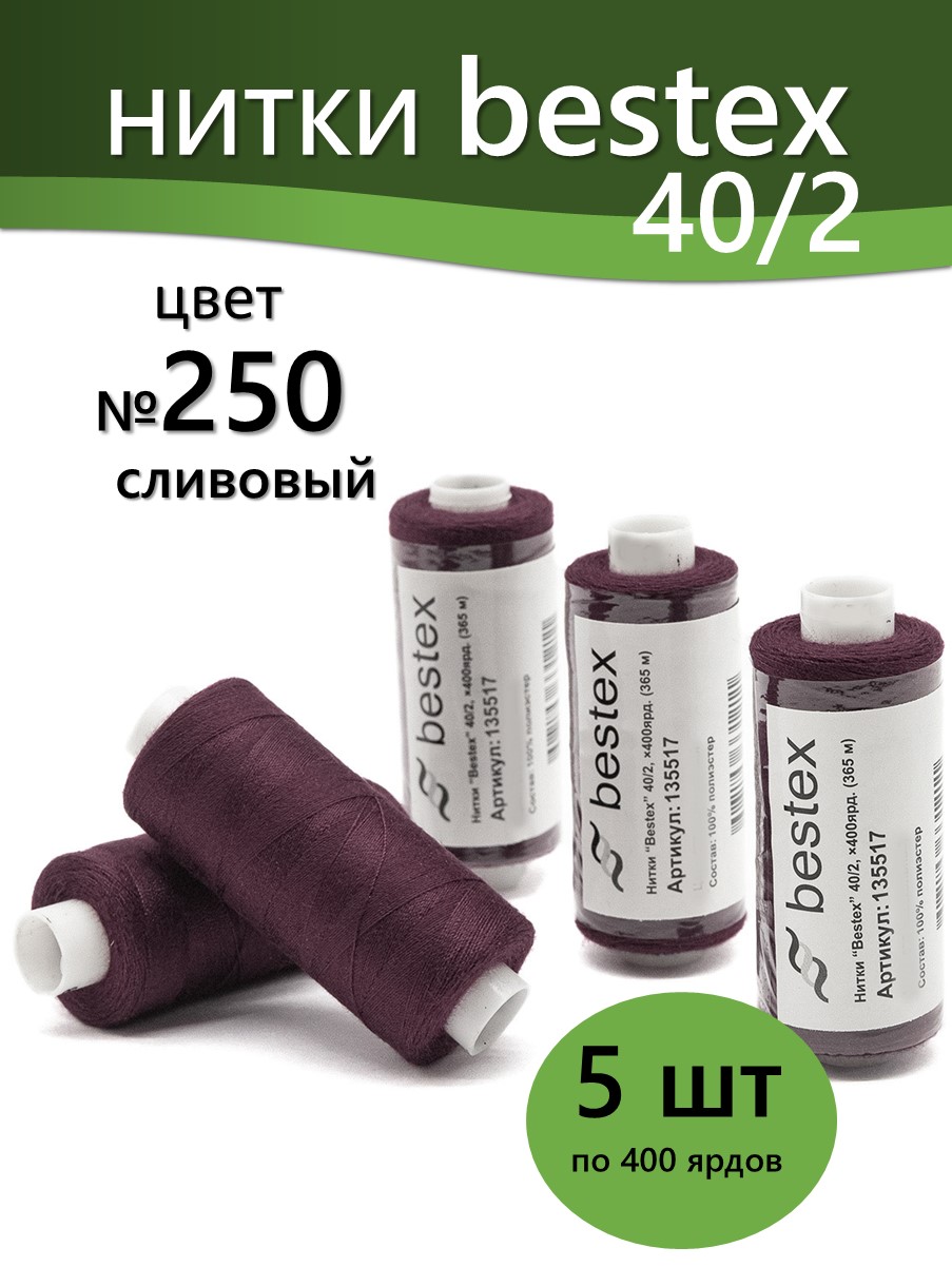 Набор ниток Bestex №40/2 – прекрасный вариант для шитья, ремонта текстильных изделий, рукоделия. Подойдут для бытовых и промышленных швейных машин. Изготовлены из 100 % полиэстера, прочные на разрыв и слегка эластичные, равномерные по толщине, имеют правостороннюю крутку. Обработаны силиконом на 3%, поэтому меньше разрываются при работе на высоких скоростях. Не истончаются и не теряют цвет после многократных стирок и от воздействия ультрафиолетовых лучей. Усадка минимальна, ворс и узелки почти не выражены. Нитки №40/2 подходят для работы с легкими тканями и тканями среднего веса. Назначение: – ремонт текстильных изделий, штопка вещей из трикотажа; – обработка срезов; – шитье вручную и на швейной машине. Линейная плотность: 14,8 x 2 текс. Разрывная нагрузка: 1050 сН. Рекомендуемый размер иглы: №80-90. В упаковке 5 бобин в намотке 400 ярдов.