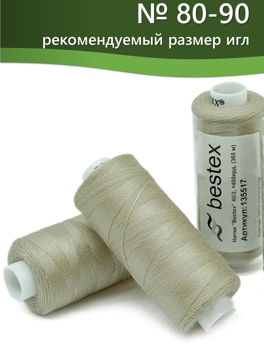 Набор ниток Bestex №40/2 – прекрасный вариант для шитья, ремонта текстильных изделий, рукоделия. Подойдут для бытовых и промышленных швейных машин. Изготовлены из 100 % полиэстера, прочные на разрыв и слегка эластичные, равномерные по толщине, имеют правостороннюю крутку. Обработаны силиконом на 3%, поэтому меньше разрываются при работе на высоких скоростях. Не истончаются и не теряют цвет после многократных стирок и от воздействия ультрафиолетовых лучей. Усадка минимальна, ворс и узелки почти не выражены. Нитки №40/2 подходят для работы с легкими тканями и тканями среднего веса. Назначение: – ремонт текстильных изделий, штопка вещей из трикотажа; – обработка срезов; – шитье вручную и на швейной машине. Линейная плотность: 14,8 x 2 текс. Разрывная нагрузка: 1050 сН. Рекомендуемый размер иглы: №80-90. В упаковке 5 бобин в намотке 400 ярдов.