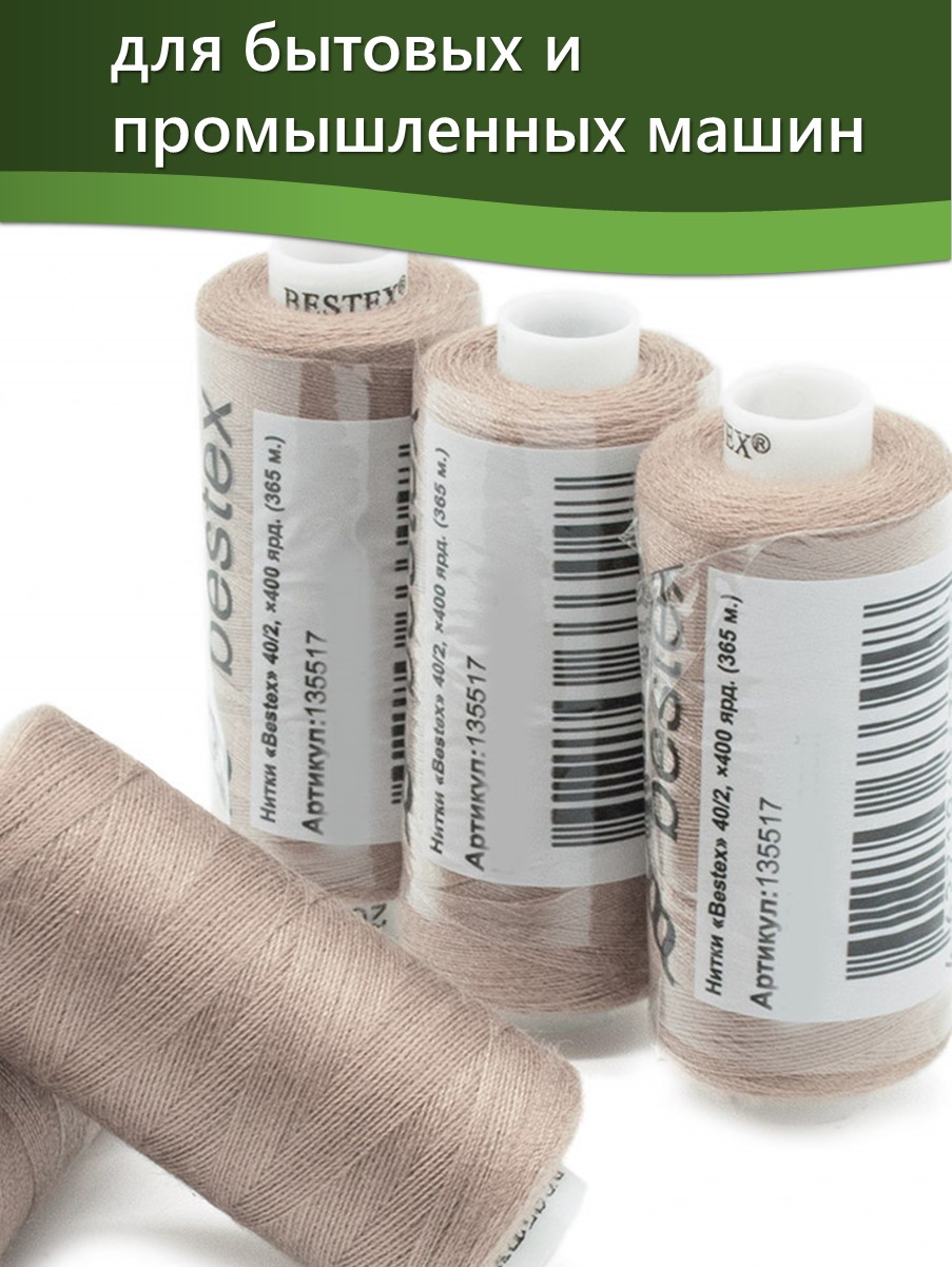 Набор ниток Bestex №40/2 – прекрасный вариант для шитья, ремонта текстильных изделий, рукоделия. Подойдут для бытовых и промышленных швейных машин. Изготовлены из 100 % полиэстера, прочные на разрыв и слегка эластичные, равномерные по толщине, имеют правостороннюю крутку. Обработаны силиконом на 3%, поэтому меньше разрываются при работе на высоких скоростях. Не истончаются и не теряют цвет после многократных стирок и от воздействия ультрафиолетовых лучей. Усадка минимальна, ворс и узелки почти не выражены. Нитки №40/2 подходят для работы с легкими тканями и тканями среднего веса. Назначение: – ремонт текстильных изделий, штопка вещей из трикотажа; – обработка срезов; – шитье вручную и на швейной машине. Линейная плотность: 14,8 x 2 текс. Разрывная нагрузка: 1050 сН. Рекомендуемый размер иглы: №80-90. В упаковке 5 бобин в намотке 400 ярдов.