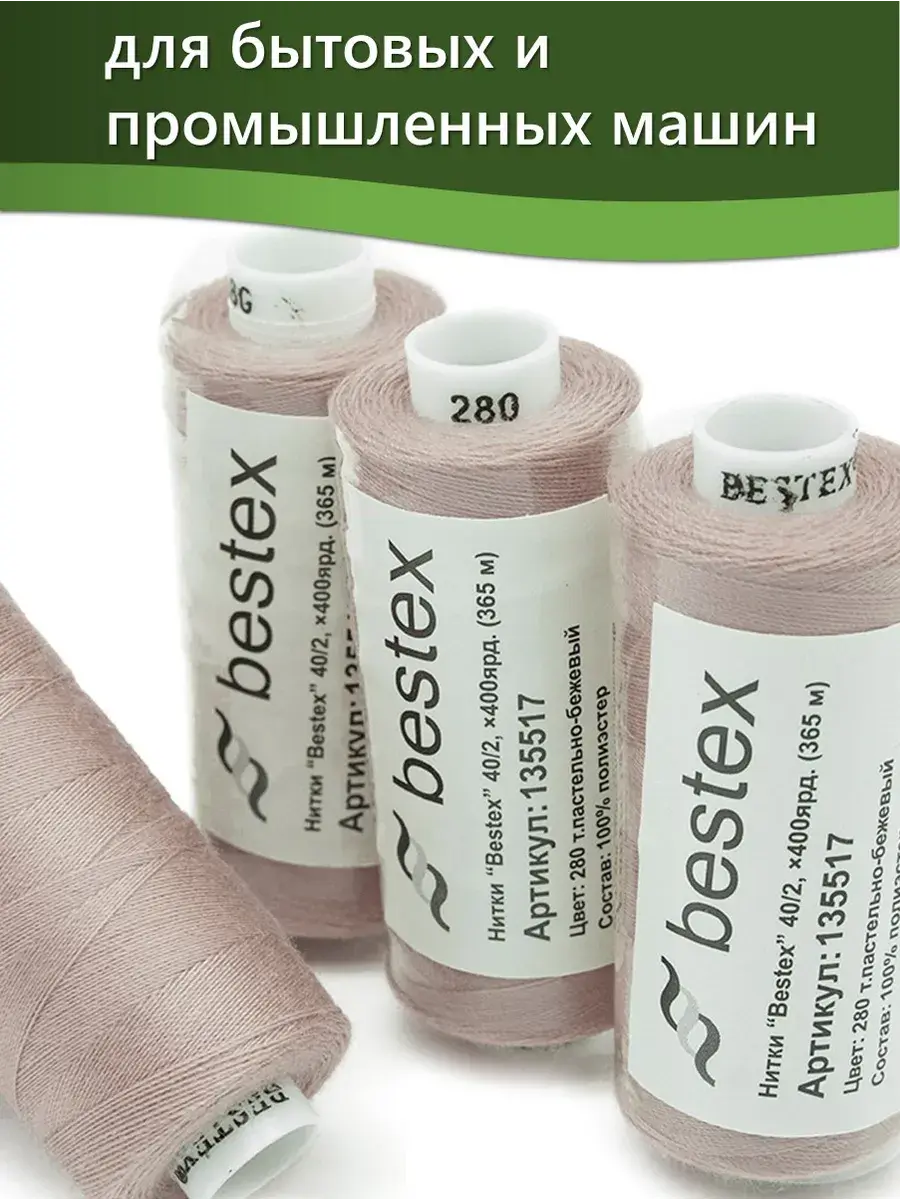 Набор ниток Bestex №40/2 – прекрасный вариант для шитья, ремонта текстильных изделий, рукоделия. Подойдут для бытовых и промышленных швейных машин. Изготовлены из 100 % полиэстера, прочные на разрыв и слегка эластичные, равномерные по толщине, имеют правостороннюю крутку. Обработаны силиконом на 3%, поэтому меньше разрываются при работе на высоких скоростях. Не истончаются и не теряют цвет после многократных стирок и от воздействия ультрафиолетовых лучей. Усадка минимальна, ворс и узелки почти не выражены. Нитки №40/2 подходят для работы с легкими тканями и тканями среднего веса. Назначение: – ремонт текстильных изделий, штопка вещей из трикотажа; – обработка срезов; – шитье вручную и на швейной машине. Линейная плотность: 14,8 x 2 текс. Разрывная нагрузка: 1050 сН. Рекомендуемый размер иглы: №80-90. В упаковке 5 бобин в намотке 400 ярдов.
