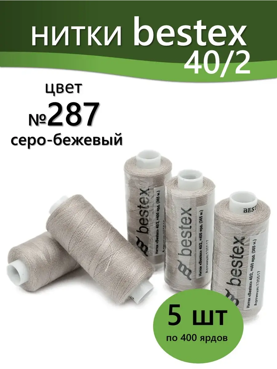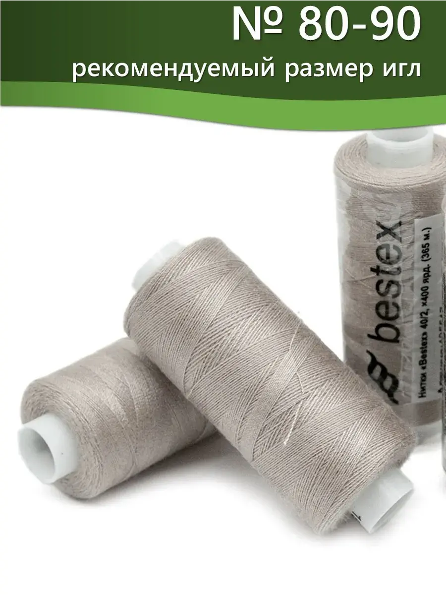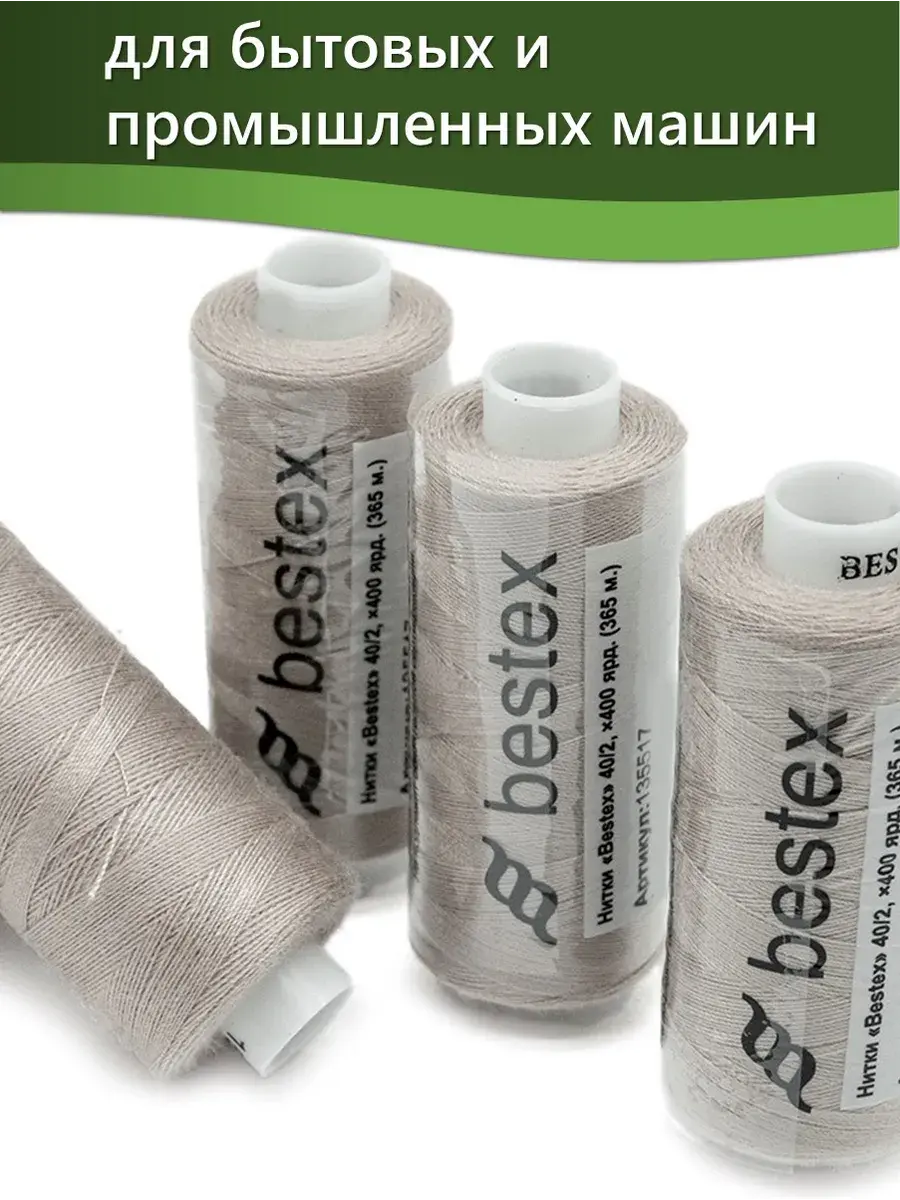 Набор ниток Bestex №40/2 – прекрасный вариант для шитья, ремонта текстильных изделий, рукоделия. Подойдут для бытовых и промышленных швейных машин. Изготовлены из 100 % полиэстера, прочные на разрыв и слегка эластичные, равномерные по толщине, имеют правостороннюю крутку. Обработаны силиконом на 3%, поэтому меньше разрываются при работе на высоких скоростях. Не истончаются и не теряют цвет после многократных стирок и от воздействия ультрафиолетовых лучей. Усадка минимальна, ворс и узелки почти не выражены. Нитки №40/2 подходят для работы с легкими тканями и тканями среднего веса. Назначение: – ремонт текстильных изделий, штопка вещей из трикотажа; – обработка срезов; – шитье вручную и на швейной машине. Линейная плотность: 14,8 x 2 текс. Разрывная нагрузка: 1050 сН. Рекомендуемый размер иглы: №80-90. В упаковке 5 бобин в намотке 400 ярдов.