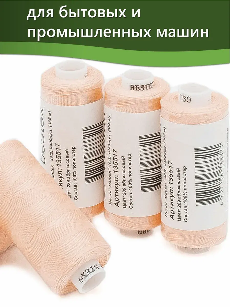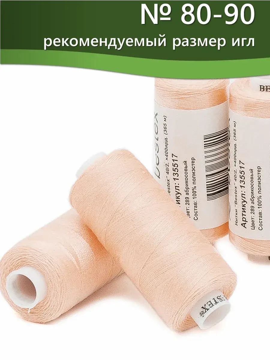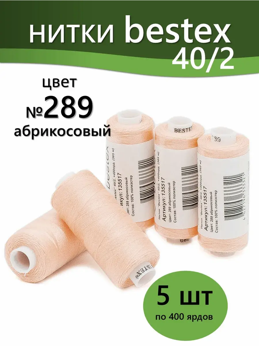 Набор ниток Bestex №40/2 – прекрасный вариант для шитья, ремонта текстильных изделий, рукоделия. Подойдут для бытовых и промышленных швейных машин. Изготовлены из 100 % полиэстера, прочные на разрыв и слегка эластичные, равномерные по толщине, имеют правостороннюю крутку. Обработаны силиконом на 3%, поэтому меньше разрываются при работе на высоких скоростях. Не истончаются и не теряют цвет после многократных стирок и от воздействия ультрафиолетовых лучей. Усадка минимальна, ворс и узелки почти не выражены. Нитки №40/2 подходят для работы с легкими тканями и тканями среднего веса. Назначение: – ремонт текстильных изделий, штопка вещей из трикотажа; – обработка срезов; – шитье вручную и на швейной машине. Линейная плотность: 14,8 x 2 текс. Разрывная нагрузка: 1050 сН. Рекомендуемый размер иглы: №80-90. В упаковке 5 бобин в намотке 400 ярдов.