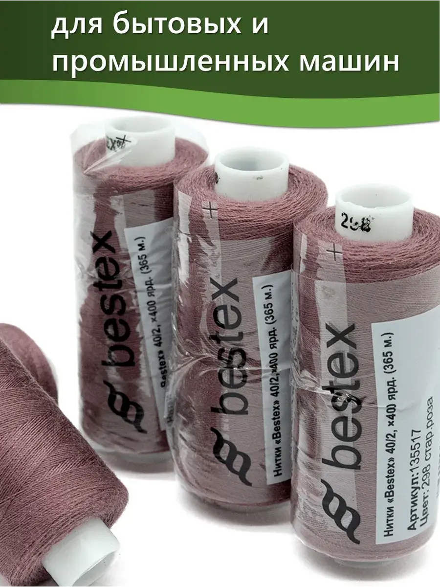 Набор ниток Bestex №40/2 – прекрасный вариант для шитья, ремонта текстильных изделий, рукоделия. Подойдут для бытовых и промышленных швейных машин. Изготовлены из 100 % полиэстера, прочные на разрыв и слегка эластичные, равномерные по толщине, имеют правостороннюю крутку. Обработаны силиконом на 3%, поэтому меньше разрываются при работе на высоких скоростях. Не истончаются и не теряют цвет после многократных стирок и от воздействия ультрафиолетовых лучей. Усадка минимальна, ворс и узелки почти не выражены. Нитки №40/2 подходят для работы с легкими тканями и тканями среднего веса. Назначение: – ремонт текстильных изделий, штопка вещей из трикотажа; – обработка срезов; – шитье вручную и на швейной машине. Линейная плотность: 14,8 x 2 текс. Разрывная нагрузка: 1050 сН. Рекомендуемый размер иглы: №80-90. В упаковке 5 бобин в намотке 400 ярдов.