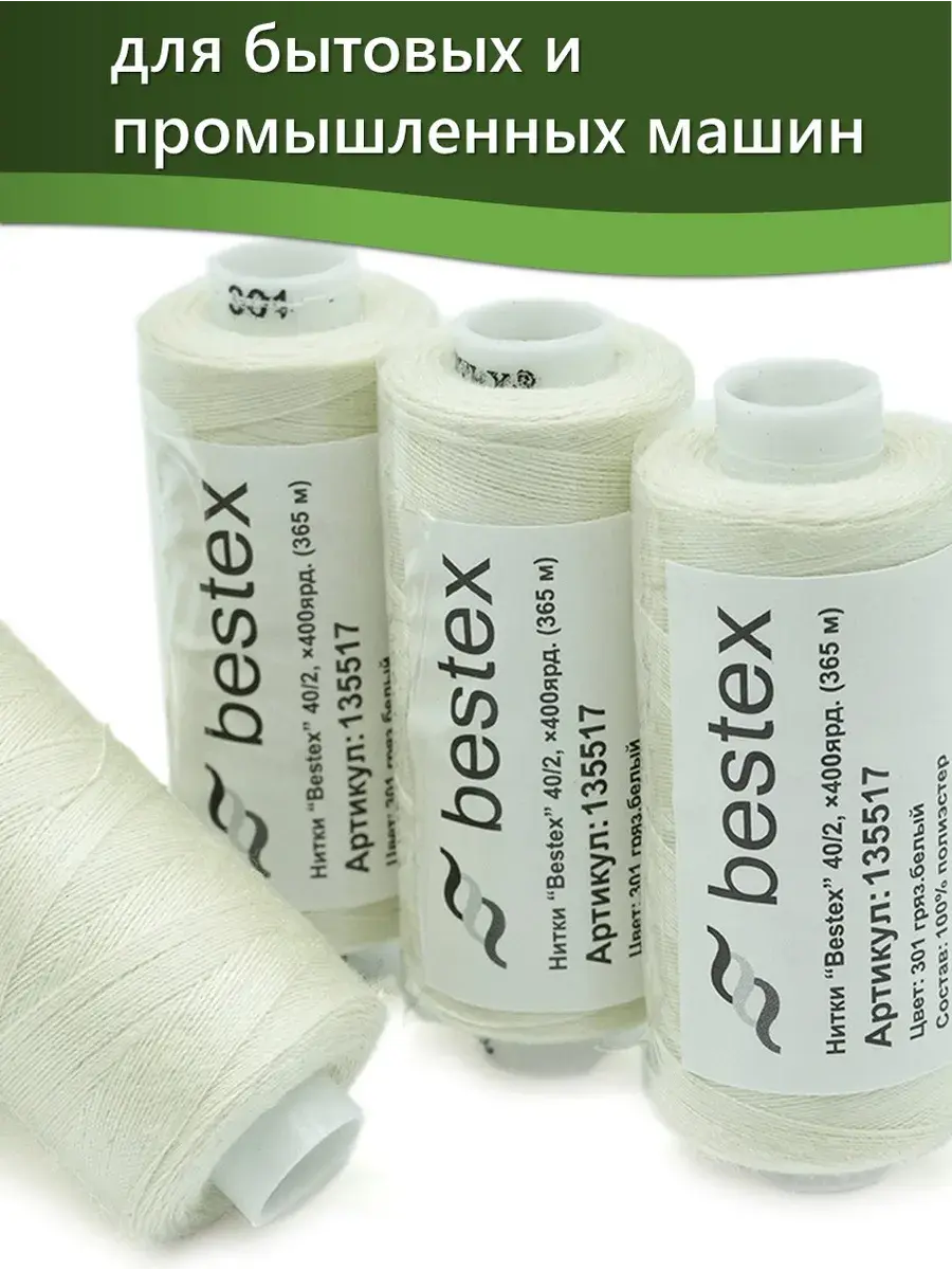 Набор ниток Bestex №40/2 – прекрасный вариант для шитья, ремонта текстильных изделий, рукоделия. Подойдут для бытовых и промышленных швейных машин. Изготовлены из 100 % полиэстера, прочные на разрыв и слегка эластичные, равномерные по толщине, имеют правостороннюю крутку. Обработаны силиконом на 3%, поэтому меньше разрываются при работе на высоких скоростях. Не истончаются и не теряют цвет после многократных стирок и от воздействия ультрафиолетовых лучей. Усадка минимальна, ворс и узелки почти не выражены. Нитки №40/2 подходят для работы с легкими тканями и тканями среднего веса. Назначение: – ремонт текстильных изделий, штопка вещей из трикотажа; – обработка срезов; – шитье вручную и на швейной машине. Линейная плотность: 14,8 x 2 текс. Разрывная нагрузка: 1050 сН. Рекомендуемый размер иглы: №80-90. В упаковке 5 бобин в намотке 400 ярдов.